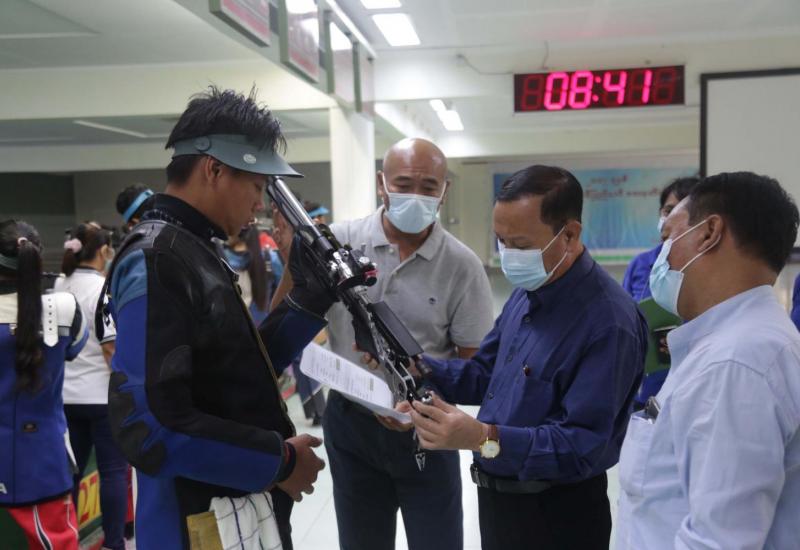 ကျန်းမာရေးနှင့် အားကစားဝန်ကြီးဌာန ဒုတိယဝန်ကြီး ဦးမျိုးလှိုင်သည် မေ (၂၂) ရက် နံနက် (၈) နာရီတွင် ရန်ကုန်မြို့ရှိ သုဝဏ္ဏကွင်းအားကစားသမားများ အိပ်ဆောင် (၄) ထပ်၊ စားရိပ်သာနှင့် မီးဖိုဆောင်များ ဆောက်လုပ်နေမှုများကိုလည်းကောင်း၊ ရန်ကုန်တိုင်းဒေသကြီး မြောက်ဒဂုံမြို့နယ် ရှိ အပြည်ပြည်ဆိုင်ရာ သေနတ်ပစ်အားကစားကွင်း၌ (၃၁) ကြိမ်မြောက် အရှေ့တောင်အာရှ အားကစားပြိုင်ပွဲ ဝင်ရောက်ယှဉ် ပြိုင်ရန်အတွက် လေ့ကျင့်ပြင်ဆင်လျက်ရှိသော မြန်မာ့ လက်ရွေးစင်သေနတ်ပစ် အားကစားသမားများ၏ မီတာ (၁၀) ရိုင်ဖယ်ပစ်ခတ်စဉ်၊ မီတာ (၅၀) စိတ်ကြိုက် ပစ္စတိုပစ်ခတ်စဉ်၊ (၂၅) မီတာ ပစ္စတို အမြန်ပစ် ပစ်ခတ်စဉ်များ လေ့ကျင့်နေမှုများကို လည်းကောင်း ကြည့်ရှုစစ်ဆေးသည်။