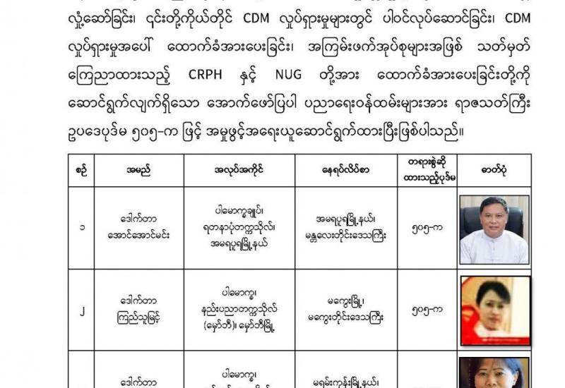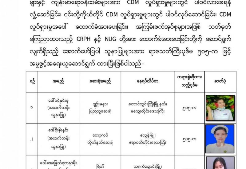 တိုင်းဒေသကြီးနှင့်ပြည်နယ်အချို့တွင် CDM လှုပ်ရှားမှုကို အခြေခံပြီး ရပ်ရွာ အေးချမ်းသာယာရေးနှင့် တရားဥပဒေစိုးမိုးမှုအား ပျက်ပြားစေရန် ရည်ရွယ်ချက်ဖြင့် အကြမ်းဖက်မှုများကို ဦးတည်စေသော ဆူပူ ဆန္ဒပြမှုများအား သွေးထိုးလှုံ့ဆော် လျက်ရှိသောကြောင့် အုပ်ချုပ်ရေးအဖွဲ့အစည်းများနှင့် လုံခြုံရေးအဖွဲ့အစည်း များက ဥပဒေနှင့်အညီ ပူးပေါင်းထိန်းသိမ်းဆောင်ရွက်လျက်ရှိသည်။