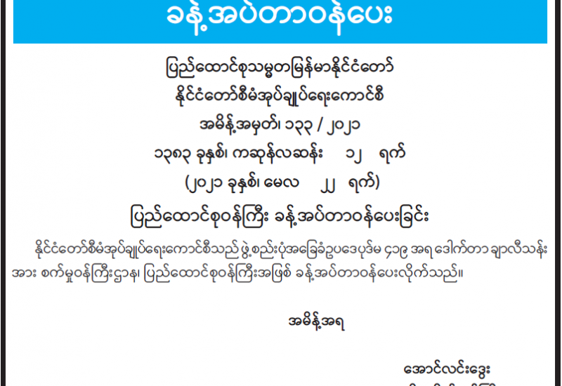 ပြည်ထောင်စု စာရင်းစစ်ချုပ် ဒေါက်တာကံဇော်သည် ယနေ့ နံနက် ၁၀ နာရီတွင် မြန်မာနိုင်ငံ စာရင်းကောင်စီ၊ မြန်မာနိုင်ငံ လက်မှတ်ရပြည်သူ့စာရင်းကိုင် များအသင်းမှ တာဝန်ရှိပုဂ္ဂိုလ် များကို ပြည်ထောင်စုစာရင်းစစ် ချုပ်ရုံး၊ ရန်ကုန်သင်တန်းကျောင်း၌ တွေ့ဆုံသည်။