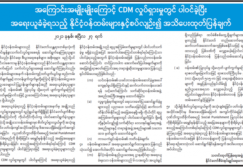 နိုင်ငံတော်အတွင်း ဆူပူအုံကြွမှုများဖြစ်ပေါ်စေရေးအတွက် နောက်ကွယ်မှ သွေးထိုးလှုံ့ဆော် နည်းမျိုးစုံဖြင့် ဆောင်ရွက်လျက်ရှိသကဲ့သို့ အဖျက်အမှောင့် ဆောင်ရွက်လိုသူအချို့မှလည်း နိုင်ငံတော် ဆန့်ကျင်ရေးစာသားများအား အများပြည်သူသုံးလမ်းမကြီးများ၊ နိုင်ငံတော်ပိုင်နှင့် အများပြည်သူပိုင် အဆောက်အအုံများပေါ်တွင် ရေးသားခြင်း၊ ဆန့်ကျင်ရေးစာသားပါ ဗီနိုင်းစများ၊ ပိုစတာများ၊ စာရွက် များအား ချိတ်ဆွဲခြင်း၊ လမ်းများပေါ်တွင် ဖြန့်ကြဲခြင်းတို့ဖြင့် နိုင်ငံတော်အတွင်း မတည်မငြိမ်ဖြစ်စေရန် ရည်ရွယ်ချက်ရှိရှိဖြင့် ဆောင်ရွက်လျက်ရှိသဖြင့် လုံခြုံရေးတပ်ဖွဲ့ဝင်များအနေဖြင့် နိုင်ငံတော် တည်ငြိမ်ရေးအတွက်ရှေ့ရှု့ကာ ဥပဒေနှင့်အညီ ဖမ်းဆီးထိန်းသိမ်းဆောင်ရွက် လျက်ရှိသည်။