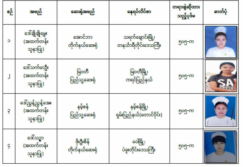 နိုင်ငံတော်၏အုပ်ချုပ်မှုယန္တရားပျက်ပြားစေရန် ရည်ရွယ်ချက်ဖြင့် နိုင်ငံ့ဝန်ထမ်းများနှင့် ကျန်းမာရေးဝန်ထမ်းများအား CDM လှုပ်ရှားမှုများတွင် ပါဝင်လာစေရန် လှုံ့ဆော်ခြင်း၊ ၎င်းတို့ကိုယ်တိုင် CDM လှုပ်ရှားမှုများတွင် ပါဝင်လုပ်ဆောင်ခြင်း၊ CDM လှုပ်ရှားမှု အပေါ် ထောက်ခံအားပေးခြင်း၊ အကြမ်းဖက်အုပ်စုများအဖြစ် သတ်မှတ်ကြေညာထားသည့် CRPH နှင့် NUG တို့အား ထောက်ခံအားပေးခြင်းတို့ကို ဆောင်ရွက်လျက်ရှိသည့် အောက်ဖော် ပြပါ သူနာပြုများအား ရာဇသတ်ကြီးပုဒ်မ ၅၀၅-က ဖြင့် အမှုဖွင့်အရေးယူဆောင်ရွက် ထားပြီးဖြစ်ပါသည်-