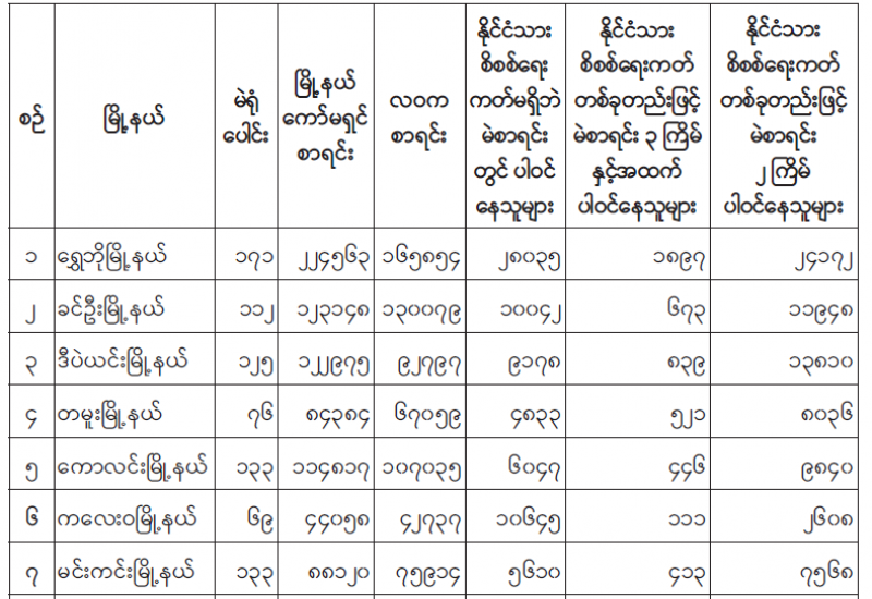 ၁။ ပြည်ထောင်စုရွေးကောက်ပွဲကော်မရှင်သည် ၂၀၂၀ ပြည့်နှစ် နိုဝင်ဘာလ ၈ ရက်နေ့တွင် ကျင်းပ ပြုလုပ်သည့် ပါတီစုံဒီမိုကရေစီအထွေထွေရွေးကောက်ပွဲနှင့်စပ်လျဉ်း၍ စစ်ကိုင်းတိုင်းဒေသကြီး၊ ရွှေဘိုမြို့နယ်၊ ခင်ဦးမြို့နယ်၊ ဒီပဲယင်းမြို့နယ်၊ တမူးမြို့နယ်၊ ကောလင်းမြို့နယ်၊ ကလေးဝမြို့နယ်နှင့် မင်းကင်းမြို့နယ် တို့၏ မဲဆန္ဒရှင်စာရင်းများနှင့် ဆန္ဒမဲလက်မှတ်များ ထုတ်ယူ ရရှိ/ သုံးစွဲ/ လက်ကျန် မြေပြင်အခြေအနေ များကို စစ်ဆေးခဲ့သည်။