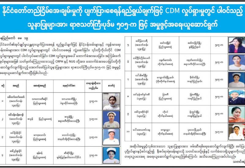 တပ်မတော်အနေဖြင့် ဆောင်ရွက်လျက်ရှိသည့် ပြည်သူ့အကျိုးပြု လုပ်ငန်းများအနက် ပြည်သူလူထုအတွက် အဓိကအကျဆုံးဖြစ်သော ကျန်းမာရေးကဏ္ဍ မြင့်မားရေးအတွက် တပ်မတော်မှပါရဂူများ၊ ဆေးမှူးများ၊ သူနာပြုများဖြင့် နယ်လှည့်ဆေးကုသ ရေးအဖွဲ့များ စုစည်း၍ ဒေသခံပြည်သူလူထုကို ကျန်းမာရေးစစ်ဆေးပေးခြင်း၊ လိုအပ်သည့် ကာကွယ်ဆေး များ ထိုးနှံပေးခြင်း၊ ခွဲစိတ်ရန်လိုအပ် သည့် လူနာများအား ခွဲစိတ်ကုသပေးခြင်း၊ ဆေးရုံ တက်ရောက်ကုသရန် လိုအပ်သော လူနာများကို ဆေးရုံတင်ကာ ကျန်းမာရေး စောင့်ရှောက် ပေးခြင်းများ ဆောင်ရွက်လျက်ရှိသည်။ ၎င်းအပြင် ပြည်သူလူထု၏ အရေးပေါ် ကျန်းမာရေး ဆိုင်ရာကုသမှုများ ဆောင်ရွက်ပေးနိုင်ရန်အတွက် တပ်မတော်ဆေးရုံများနှင့် ယာယီကုသရေး ဆေးရုံများတွင် ကျန်းမာရေး စောင့်ရှောက်မှုများကို နေ့ညမပြတ် ဆောင်ရွက်ပေး လျက်ရှိရာ ဖေဖော်ဝါရီ ၅ ရက်မှ ယနေ့အထိ ပြင်ပလူနာပေါင်း ၂၁၁၁၈၆ ဦးနှင့် အတွင်းလူနာပေါင်း ၆၄၄၃၉ ဦးတို့ကို ကုသပေးနိုင်ခဲ့သည်။