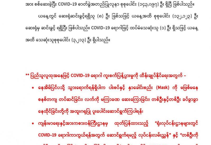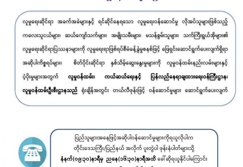 လူမှုဝန်ထမ်းဦးစီးဌာနတွင် ကိုဗစ်-၁၉ ကြောင့် ခေတ္တရပ်ဆိုင်းခဲ့ရသည့် လုပ်ငန်းများ အကောင် အထည်ဖော်နိုင်ရေးနှင့်ပတ်သက်၍ ရှင်းလင်းတင်ပြခြင်းအစည်းအဝေးကို ယနေ့တွင် လူမှုဝန်ထမ်း၊ ကယ်ဆယ်ရေးနှင့် ပြန်လည်နေရာချထားရေးဝန်ကြီးဌာန ဝန်ကြီးရုံး အစည်းအဝေးခန်းမ၌ ကျင်းပ သည်။