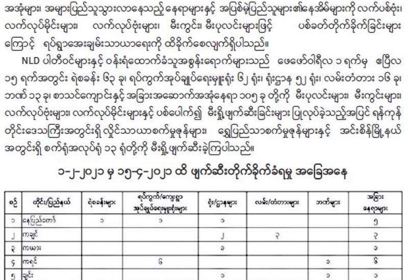 မြို့နယ်အချို့၌ ဆူပူအကြမ်းဖက်သူများအနေဖြင့် မြို့နယ်အချို့၌ ဆူပူအကြမ်းဖက်သူများမှ နိုင်ငံတော်ပိုင် အဆောက်အဦများ၊ အများပြည်သူပိုင် အဆောက်အဦ များအား မီးရှို့ဖျက်ဆီးမှုများ ဆောင်ရွက်လျက်ရှိသည်။