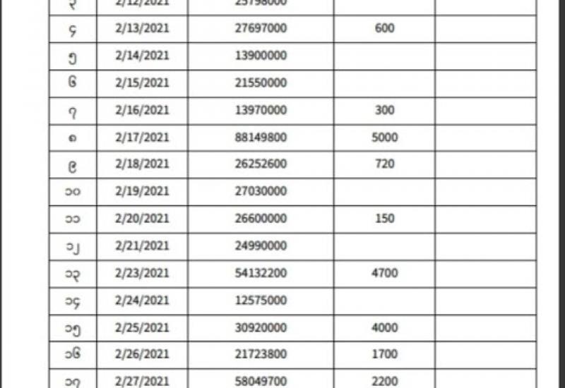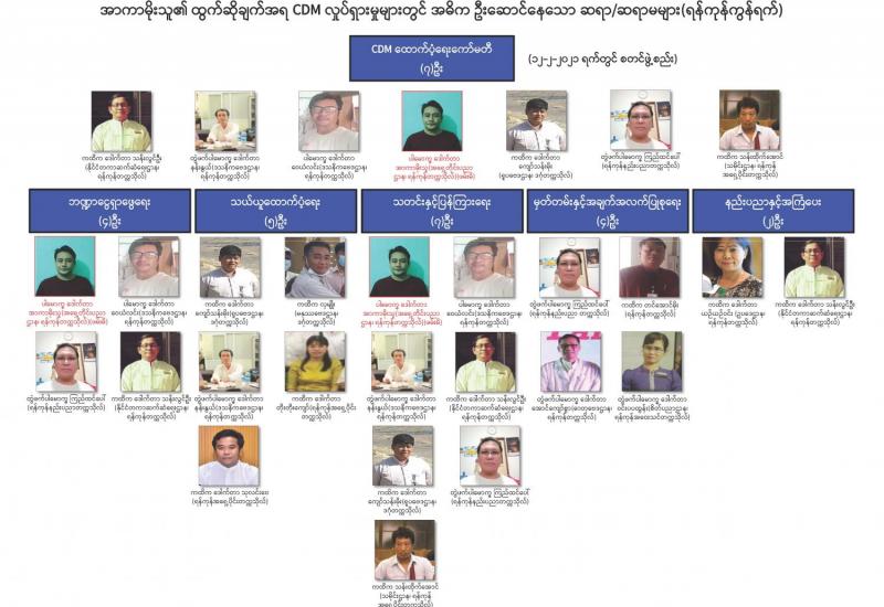 ရန်ကုန်တိုင်းဒေသကြီး၊ ဒဂုံမြို့သစ်(မြောက်ပိုင်း)မြို့နယ်၊ အမှတ်(၄၂)ရပ်ကွက်၊ ဗိုလ်မှူး ဗထူးလမ်း၊ အမှတ်(၁၃/က) ရှိ နာရေးကူညီမှုအသင်း(ရန်ကုန်)၏ ဘဏ္ဍာရေးမှူး ဖြစ်သူ ဒေါ်မြင့်မြင်ခင်ဖေ(ခ)ဒေါ်ရွှေဇီးကွက် အား CDM တွင် ပါဝင်လှုပ်ရှားနေသည့် နိုင်ငံ့ဝန်ထမ်းများအား အားပေးအားမြှောက်ပြုမှုဖြင့် ဖေဖော်ဝါရီ ၂၅ ရက်နေ့တွင် မရမ်းကုန်း မြို့မရဲစခန်း၌ ရာဇသတ်ကြီး ပုဒ်မ ၅၀၅(က)ဖြင့် အမှုဖွင့်တိုင်ကြားခဲ့ကြောင်း သိရှိရသည်။