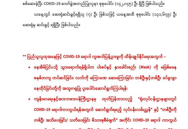 တိုင်းဒေသကြီးနှင့် ပြည်နယ်များရှိ တိုင်းရင်းသားပြည်သူများ၏ ကျန်းမာရေး ဆိုင်ရာအခက်အခဲများကို တစ်ထောင့် တစ်နေရာမှ အထောက်အကူပြုစေရန်အတွက် မြို့နယ်အသီးသီးရှိ တပ်မတော်ဆေးရုံများနှင့် ယာယီ ကုသရေးဆေးရုံများတွင် ကျန်းမာရေး စောင့်ရှောက်မှုများကို ဆောင်ရွက်ပေးလျက်ရှိရာ ဖေဖော်ဝါရီ ၅ ရက်မှ ယနေ့အထိ ပြင်ပလူနာ ၅၃၂၇၉ ဦး၊ အတွင်းလူနာ ၃၆၄၄ ဦးကို တပ်မတော်မှ ပါရဂူများ၊ ဆေးမှူးများ၊ သူနာပြု များဖြင့် ကျန်းမာရေးစစ်ဆေးပေးခြင်း၊ ခွဲစိတ်ရန် လိုအပ်သည့်လူနာများအား ခွဲစိတ်ပေးခြင်း၊ ဆေးရုံ တက်ရောက် ကုသရန် လိုအပ်သော လူနာများကို ဆေးရုံတင်ကာ ကျန်းမာရေးစောင့်ရှောက် ပေးခြင်းများ ဆောင်ရွက် ပေးသည့် အပြင် ဆေးရုံတက်လူနာများနှင့် လူနာစောင့်များ နေထိုင်စားသောက်ရေး အဆင်ပြေစေရန်အတွက်ကိုပါ စီမံ ဆောင်ရွက်ပေးသည်။