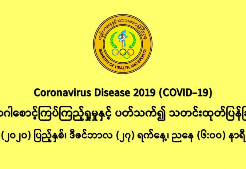 (၂၆-၁၂-၂၀၂၀) ရက်နေ့၊ ည (၈:၀၀) နာရီမှ (၂၇-၁၂-၂၀၂၀) ရက်နေ့၊ ည (၈:၀၀) နာရီ အတွင်း ဓာတ်ခွဲနမူနာ စုစုပေါင်း (၁၆,၆၀၇) ခုအား စစ်ဆေးပြီးစီးခဲ့ရာ COVID-19 ရောဂါ ဓာတ်ခွဲ အတည်ပြု လူနာသစ် (၆၀၆) ဦး တွေ့ရှိရပါသည်။