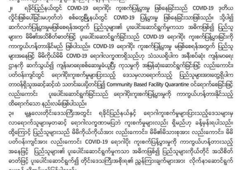 ကျန်းမာရေးနှင့် အားကစားဝန်ကြီးဌာနက (၂၉-၃-၂၀၂၀) ရက်နေ့တွင် ထုတ်ပြန်ခဲ့သော နိုင်ငံတကာ ခရီးသည်တင်လေကြောင်းခရီးစဉ်များ မြန်မာနိုင်ငံသို့ ပျံသန်းဆင်းသက်ခြင်းကို ယာယီ ကန့်သတ် ခြင်းဆိုင်ရာ ညွှန်ကြားချက် (Temporary Measures to Prevent Importation of COVID-19 to Myanmar through Air Travel) ၏ သက်ရောက်မှုကာလကို COVID-19 ရောဂါ ကာကွယ်၊ ထိန်းချုပ်၊ ကုသရေး အမျိုးသား အဆင့်ဗဟိုကော်မတီ၏ ခွင့်ပြုချက်ဖြင့် (၃၁-၈-၂၀၂၀) ရက်နေ့၊ မြန်မာစံတော် ချိန် (၂၃:၅၉) နာရီအထိ တိုးမြှင့် သတ်မှတ်ခဲ့ပါသည်။