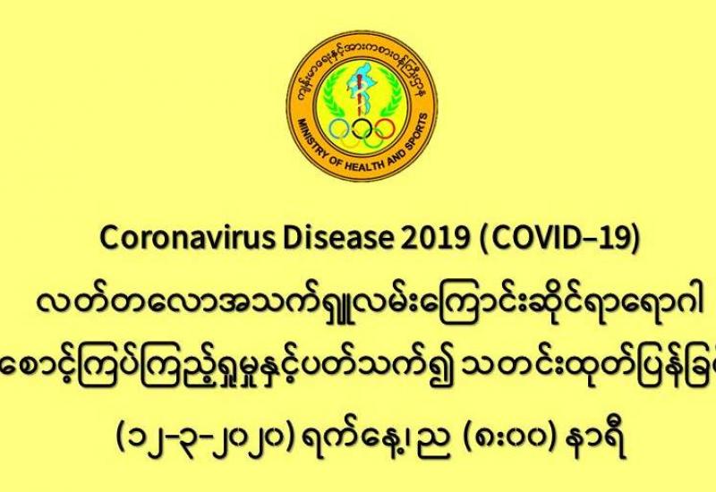 ၁။ ကျန်းမာရေးနှင့်အားကစားဝန်ကြီးဌာနသည် ကမ္ဘာ့နိုင်ငံများတွင် ကူးစက်ပျံ့နှံ့လျက်ရှိသည့် COVID-19 လတ်တလောအသက်ရှူလမ်းကြောင်းဆိုင်ရာ ရောဂါဖြစ်ပွားမှုဖြစ်စဉ်နှင့်ပတ်သက်၍ ရောဂါစောင့်ကြပ်ကြည့်ရှုခြင်း လုပ်ငန်းများအား အပြည်ပြည်ဆိုင်ရာ ဝင်ပေါက်၊ ထွက်ပေါက်ဂိတ် များတွင်လည်းကောင်း၊ ဆေးရုံအခြေပြုအဖြစ်လည်းကောင်း၊ ပြည်သူလူထုအခြေပြု စောင့်ကြပ် ကြည့်ရှုခြင်းလုပ်ငန်းများဖြင့်လည်းကောင်း၊ ပုဂ္ဂလိကဆေးရုံများနှင့် ပူးပေါင်း၍လည်းကောင်း ဆောင်ရွက်လျက်ရှိပါသည်။