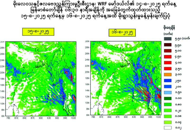 ယနေ့ညနေ ၅ နာရီခွဲတိုင်းထွာချက်များအရ ကပ္ပလီပင်လယ်ပြင်နှင့် ဘင်္ဂလားပင်လယ်အော်တို့တွင် မုတ်သုံလေ အားကောင်းလာနိုင်ခြင်းကြောင့်လည်းကောင်း၊ ဘင်္ဂလားပင်လယ်အော်အနောက် မြောက်ပိုင်းနှင့် ယင်းနှင့်ဆက်စပ်လျက်ရှိသော ဘင်္ဂလားပင်လယ်အော်အနောက် အလယ်ပိုင်း၊ (အိန္ဒိယနိုင်ငံ၊ ဩရိဿ ပြည်နယ်တောင်ပိုင်း-အင်ဒရာပရာဒေ့ရှ် မြောက်ပိုင်းကမ်းခြေ)၌ ဖြစ်ပေါ်နေသော လေဖိအားနည်းရပ်ဝန်း၏ အရှိန်ကြောင့်လည်းကောင်း ယနေ့ညမှ ဩဂုတ် ၁၇ ရက်အတွင်း မန္တလေးတိုင်းဒေသကြီး၊ မကွေးတိုင်းဒေသကြီး၊ စစ်ကိုင်းတိုင်းဒေသ ကြီးအောက်ပိုင်းနှင့် ကယားပြည်နယ်တို့တွင် နေရာကျဲကျဲနှင့် နေပြည်တော်၊ ရန်ကုန်တိုင်းဒေသကြီး၊ ပဲခူးတိုင်းဒေသ ကြီး၊ စစ်ကိုင်းတိုင်းဒေသကြီးအထက်ပိုင်း၊ ဧရာဝတီတိုင်းဒေသကြီး၊ တနင်္သာရီတိုင်းဒေသကြီး၊ ကချင်ပြည်နယ်၊ ကရင်ပြည်နယ်၊ ချင်းပြည်နယ်၊ မွန်ပြည်နယ်၊ ရခိုင်ပြည်နယ်နှင့် ရှမ်းပြည်နယ်တို့တွင် နေရာစိပ်စိပ်မှ နေရာအနှံ့အပြား မိုးထစ်ချုန်းရွာပြီး နေရာကွက်၍ မိုးကြီးမည်။ မြန်မာ့ကမ်းရိုးတန်း တစ်လျှောက်နှင့် ကမ်းလွန်ပင်လယ်ပြင်တို့တွင် တစ်ခါတစ်ရံ မိုးသက်လေပြင်းများကျရောက်ပြီး လှိုင်းကြီးနိုင်သည်။ မိုးသက်လေပြင်းကျစဉ် ရေပြင်/မြေပြင်လေသည် တစ်နာရီလျှင် မိုင် ၃၀ မှ ၃၅ မိုင်အထိ တိုက်ခတ်နိုင်သည်။ လှိုင်းအမြင့်မှာ မြန်မာ့ကမ်းရိုးတန်းတစ်လျှောက်နှင့် ကမ်းလွန်ပင်လယ်ပြင်တို့တွင် ကိုးပေမှ ၁၁ ပေခန့်ရှိနိုင်သည်။