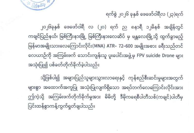 ကချင်ပြည်နယ်၏ အဓိကလေကြောင်းဗဟိုချက်တစ်ခုဖြစ်သော အများပြည်သူသွားလာရေးနှင့် ကုန်စည်စီးဆင်းမှုမြန်ဆန်စေရေးအတွက် များစွာအထောက်အကူပြုလျက်ရှိသည့် မြစ်ကြီးနားလေဆိပ်အား KIA အဖွဲ့နှင့် PDF အမည်ခံ အကြမ်းဖက်သောင်းကျန်းသူပူးပေါင်းအဖွဲ့များက ဖေဖော်ဝါရီ ၂၀ ရက် ည ၈ နာရီ ၁၂ မိနစ်ခန့်တွင် FPV Suicide Drone များအသုံးပြု၍ ခရီးသွားပြည်သူများ သေဆုံး၊ ထိခိုက်ဒဏ်ရာရရှိစေရန် ယုတ်မာပက်စက်သော ရည်ရွယ်ချက်ဖြင့် ပစ်ခတ်တိုက်ခိုက်ခဲ့မှုအပေါ် ဒေသခံပြည်သူများအပြင် တစ်နိုင်ငံလုံးရှိ ပြည်သူလူထုတစ်ရပ်လုံးကပါ လုံးဝလက်ခံနိုင်ခြင်းမရှိဘဲ အဖွဲ့အစည်းအသီးသီးမှလည်း ကန့်ကွက်ရှုတ်ချလျက်ရှိကြပြီး ပြည်ထောင်စုသမ္မတမြန်မာနိုင်ငံတော် ကချင်ပြည်နယ်အထူးဒေသ(၁)၊ ထာဝရငြိမ်းချမ်းရေးအဖွဲ့ချုပ် ဦးဆောင်ကော်မတီနှင့် ဒီမိုကရေစီပါတီသစ်(ကချင်)ပါတီတို့ကလည်း ပြင်းထန်စွာကန့်ကွက်ရှုတ်ချပါကြောင်း အောက်ပါအတိုင်း သဘောထားများ အသီးသီးထုတ်ပြန်ခဲ့ကြကြောင်း သိရှိရသည်။