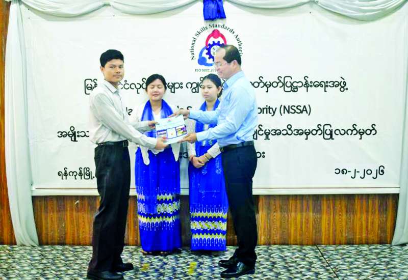 မြန်မာနိုင်ငံလုပ်သားများ ကျွမ်းကျင်မှုစံသတ်မှတ်ပြဋ္ဌာန်းရေးအဖွဲ့ (NSSA) ၏ အမျိုးသားအဆင့် အလုပ်အကိုင်ဆိုင်ရာ ကျွမ်းကျင်မှုအသိအမှတ်ပြုလက်မှတ်ပေး အပ်ပွဲအခမ်းအနားကို ယနေ့နံနက်ပိုင်းက ရန်ကင်းမြို့နယ်ရှိ ကျွမ်းကျင်မှုလေ့ကျင့်ရေးသင်တန်းကျောင်း၌ ကျင်းပသည်။