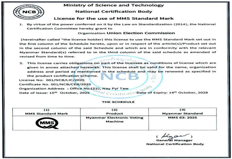 ၂၀၂၅ ခုနှစ်၊ ပါတီစုံဒီမိုကရေစီအထွေထွေရွေးကောက်ပွဲတွင် အသုံးပြုမည့် မြန်မာအီလက်ထရောနစ်မဲပေးစက်(MEVM)များကို ပြည်တွင်းနည်းပညာရှင်များက ပထမဆုံးတီထွင်ထုတ်လုပ်ထားခြင်းဖြစ်သဖြင့် စက်၏အရည်အသွေးနှင့် စံချိန်စံညွှန်းကို စစ်ဆေးပေးနိုင်ရေးတင်ပြခဲ့ရာ အမျိုးသားစံချိန်စံညွှန်းကောင်စီက မြန်မာအီလက်ထရောနစ်မဲပေးစနစ်ဆိုင်ရာ စံချိန်စံညွှန်းရေးဆွဲရေးနည်းပညာဆပ်ကော်မတီကို သက်ဆိုင်ရာကဏ္ဍအလိုက် ပညာရှင်များပါဝင်သည့် အဖွဲ့ဝင် ၂၀ ဦးဖြင့် ဖွဲ့စည်းခဲ့ပါသည်။ အဆိုပါနည်းပညာဆပ်ကော်မတီအနေဖြင့် မြန်မာအီလက်ထရောနစ်မဲပေးစက်ဆိုင်ရာစံချိန်စံညွှန်း (မူကြမ်း)ကို ရေးဆွဲတင်ပြခဲ့သဖြင့် အမျိုးသားစံချိန်စံညွှန်းကောင်စီအနေဖြင့် စံချိန်စံညွှန်းသတ်မှတ်ခြင်းဆိုင်ရာ ဥပဒေပုဒ်မ ၃၃ ပုဒ်မခွဲ (ခ) အရ အပ်နှင်းထားသော လုပ်ပိုင်ခွင့်ကို ကျင့်သုံး၍ ပုဒ်မ ၅ ပုဒ်မခွဲ (ခ)ပါ လုပ်ငန်းတာဝန်အရ ၂ - ၉ - ၂၀၂၅ ရက်စွဲပါ အမိန့်ကြော်ငြာစာအမှတ်၊ ၀၇၅/၂၀၂၅ ဖြင့် မြန်မာအီလက်ထရောနစ်မဲပေးစက်ဆိုင်ရာ စံချိန်စံညွှန်းကို မြန်မာစံချိန်စံညွှန်းအဖြစ် သတ်မှတ်ခဲ့ပါသည်။