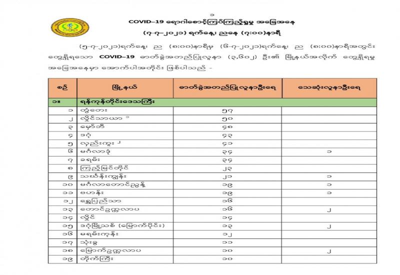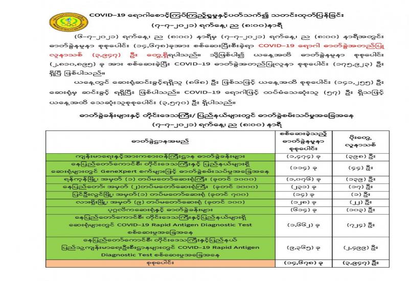 COVID-19 ရောဂါစောင့်ကြပ်ကြည့်ရှုမှုနှင့်ပတ်သက်၍ သတင်းထုတ်ပြန်ခြင်း (၇-၇-၂၀၂၁) ရက်နေ့၊ ည (၈:၀၀)နာရီ