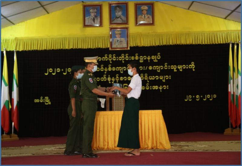 အနောက်ပိုင်း တိုင်းစစ်ဌာနချုပ်၌ ၂၀၂၁-၂၀၂၂ ပညာသင်နှစ် ကျောင်းသား/ ကျောင်းသူများအား ကျောင်းဝတ်စုံနှင့် စာရေးကိရိယာများ ထောက်ပံ့ပေးအပ်ပွဲကို ယနေ့နေ့လယ်ပိုင်းတွင် တိုင်းစစ်ဌာနချုပ်၊ အမ်းတောင်ခန်းမ၌ ပြုလုပ်ရာ တိုင်းမှူး ဗိုလ်ချုပ် ထင်လတ်ဦးနှင့် အဖွဲ့ဝင်များ၊ အရာရှိ၊ စစ်သည်များ၊ ဆရာ၊ ဆရာမများ၊ ကျောင်းသား မိဘများနှင့် ကျောင်းသား/ကျောင်းသူများ တက်ရောက်ကြသည်။