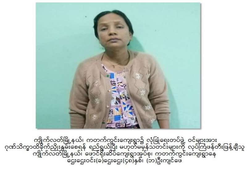 လုံခြုံရေးတပ်ဖွဲ့ဝင်များသည် ဆူပူအကြမ်းဖက်မှုလုပ်ရပ်များတွင် အသုံးပြုမည့် လက်နက်၊ ပစ္စည်း၊ ကိရိယာများအား ပြုလုပ်သူ၊ လက်ဝယ်ထားရှိသူများအား ဆက်လက်ဖော်ထုတ်ထိန်းသိမ်း လျက်ရှိရာ မေလ ၂၂ ရက် မွန်းလွဲ ၂ နာရီခွဲခန့် တွင် ဧရာဝတီတိုင်းဒေသကြီး၊ ရေကြည်မြို့နယ်၊ အသုတ်မြို့ (၅)ရပ်ကွက်နေ ဦးမြဦး(စိစစ်ဆဲ)၏ နေအိမ်သို့ လုံခြုံရေးတပ်ဖွဲ့ဝင်များက သတင်းအရ ဝင်ရောက် ရှာဖွေရာ ဦးမြဦး၏ ဇနီးဖြစ်သူ ဒေါ်မြတ်မွန်ကြူ(ခ)ခင်နှင်းသက်(၅၀)နှစ် (ဘ)ဦးကိုသန်း အား တွေ့ရှိထိန်းသိမ်းပြီး နေအိမ်အတွင်းမှ ဆူပူအကြမ်းဖက်ရာတွင် အသုံးပြုသည့် နိုင်ငံတော် ဆန့်ကျင်ရေးစာသားပါ ဗီနိုင်း ၃ ခု၊ ဓားရှည် ၁ ချောင်း၊ သံပိုက်ဖြင့် ပြုလုပ်ထားသည့် ဒူးလေး ၁ လက်၊ မြှားတံ ၂၅ ချောင်းတို့အား သိမ်းဆည်းရမိခဲ့သည်။