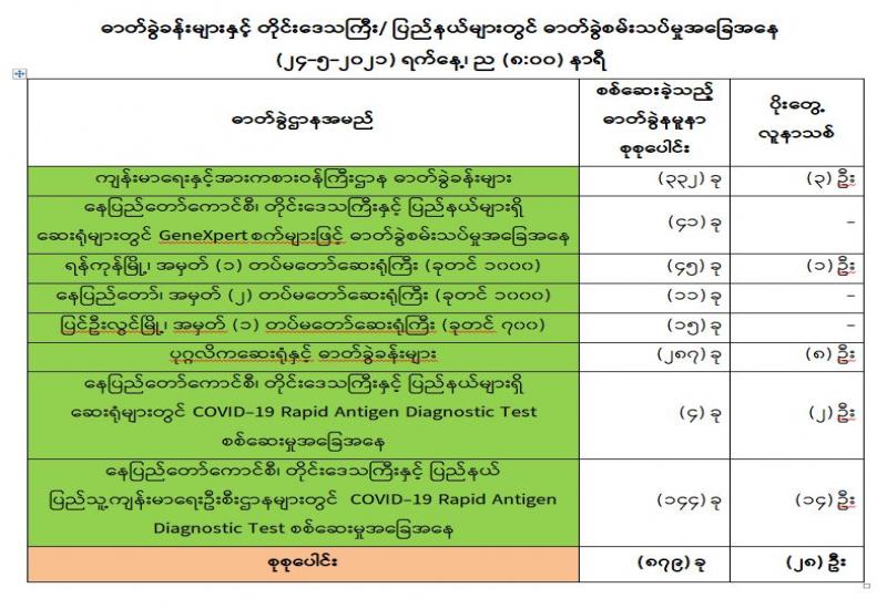 (၂၃-၅-၂၀၂၁) ရက်နေ့၊ ည (၈:၀၀) နာရီမှ (၂၄-၅-၂၀၂၁) ရက်နေ့၊ ည (၈:၀၀) နာရီအတွင်း ဓာတ်ခွဲနမူနာစုစုပေါင်း (၈၇၉) ခုအား စစ်ဆေးပြီးစီးခဲ့ရာ COVID-19 ရောဂါ ဓာတ်ခွဲအတည်ပြု လူနာသစ် (၂၈) ဦး တွေ့ရှိရပါသည်။ သို့ဖြစ်ပါ၍ ယနေ့အထိ ဓာတ်ခွဲနမူနာ စုစုပေါင်း (၂,၆၁၁,၆၂၆) ခု အား စစ်ဆေးခဲ့ပြီး COVID-19 ဓာတ်ခွဲအတည်ပြုလူနာ စုစုပေါင်း (၁၄၃,၂၆၂) ဦး ရှိပြီ ဖြစ်ပါသည်။