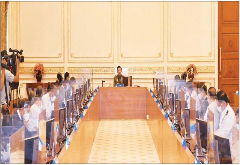 နိုင်ငံတော်စီမံအုပ်ချုပ်ရေးကောင်စီ စီမံခန့်ခွဲရေးကော်မတီ အစည်းအဝေး (၇/၂၀၂၁) ကို ယနေ့နံနက်ပိုင်းတွင် နေပြည်တော်ရှိ နိုင်ငံတော်စီမံအုပ်ချုပ်ရေးကောင်စီဥက္ကဋ္ဌရုံး အစည်းအဝေးခန်းမ၌ ကျင်းပရာ နိုင်ငံတော်စီမံအုပ်ချုပ်ရေး ကောင်စီဥက္ကဋ္ဌ၊ တပ်မတော် ကာကွယ်ရေးဦးစီးချုပ် ဗိုလ်ချုပ်မှူးကြီး မင်းအောင်လှိုင် တက်ရောက်အမှာစကား ပြောကြားသည်။
