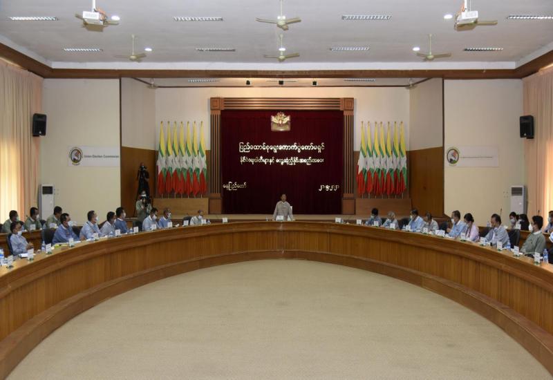 ပြည်ထောင်စုရွေးကောက်ပွဲကော်မရှင်နှင့် နိုင်ငံရေးပါတီများ တွေ့ဆုံညှိနှိုင်းအစည်းအဝေးကို ယနေ့ နံနက် ၉ နာရီတွင် နေပြည်တော်ရှိ ပြည်ထောင်စုရွေးကောက်ပွဲကော်မရှင်ရုံး အစည်းအဝေးခန်းမ၌ ကျင်းပပြုလုပ်ရာ ပြည်ထောင်စုရွေးကောက်ပွဲကော်မရှင်ဥက္ကဋ္ဌ ဦးသိန်းစိုးနှင့် ကော်မရှင်အဖွဲ့ဝင်များ၊ ကော်မရှင်ရုံးမှ တာဝန်ရှိသူများနှင့် နိုင်ငံရေးပါတီ ၅၉ ပါတီမှ တာဝန်ရှိသူများတက်ရောက်ကြသည်။