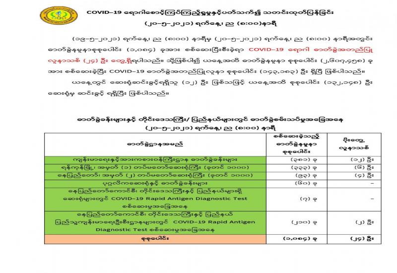 တပ်မတော်အနေဖြင့် ဆောင်ရွက်လျက်ရှိသည့် ပြည်သူ့အကျိုးပြု လုပ်ငန်းများအနက် ပြည်သူလူထုအတွက် အဓိကအကျဆုံးဖြစ်သော ကျန်းမာရေးကဏ္ဍ မြင့်မားရေးအတွက် တပ်မတော်မှပါရဂူများ၊ ဆေးမှူးများ၊ သူနာပြုများဖြင့် နယ်လှည့်ဆေးကုသ ရေးအဖွဲ့များ စုစည်း၍ ဒေသခံပြည်သူလူထုကို ကျန်းမာရေးစစ်ဆေးပေးခြင်း၊ လိုအပ်သည့် ကာကွယ်ဆေး များ ထိုးနှံပေးခြင်း၊ ခွဲစိတ်ရန်လိုအပ် သည့် လူနာများအား ခွဲစိတ်ကုသပေးခြင်း၊ ဆေးရုံ တက်ရောက်ကုသရန် လိုအပ်သော လူနာများကို ဆေးရုံတင်ကာ ကျန်းမာရေး စောင့်ရှောက် ပေးခြင်းများ ဆောင်ရွက်လျက်ရှိသည်။ ၎င်းအပြင် ပြည်သူလူထု၏ အရေးပေါ် ကျန်းမာရေး ဆိုင်ရာကုသမှုများ ဆောင်ရွက်ပေးနိုင်ရန်အတွက် တပ်မတော်ဆေးရုံများနှင့် ယာယီကုသရေး ဆေးရုံများတွင် ကျန်းမာရေး စောင့်ရှောက်မှုများကို နေ့ညမပြတ် ဆောင်ရွက်ပေး လျက်ရှိရာ ဖေဖော်ဝါရီ ၅ ရက်မှ ယနေ့အထိ ပြင်ပလူနာပေါင်း ၂၁၁၁၈၆ ဦးနှင့် အတွင်းလူနာပေါင်း ၆၄၄၃၉ ဦးတို့ကို ကုသပေးနိုင်ခဲ့သည်။
