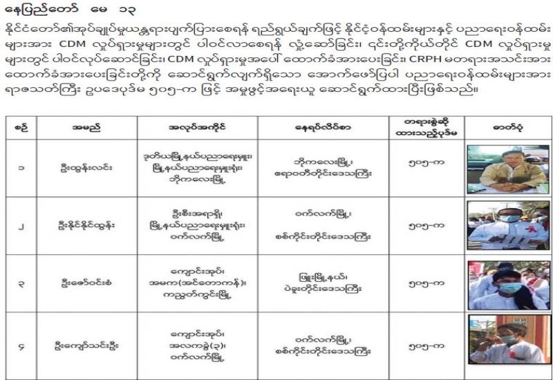 ဆူပူအကြမ်းဖက်မှုကို လိုလားပြီး နိုင်ငံ၏ အုပ်ချုပ်မှုယန္တရားပုံမှန် လည်ပတ်ရေးနှင့် တိုင်းပြည် တည်ငြိမ်အေးချမ်းရေးကို မလို လားသူများက CDM လှုပ်ရှားမှု တွင် မပါဝင်သည့် ကျန်းမာရေး ၊ ဝန်ထမ်းများ၊ ပညာရေးဝန်ထမ်း များ၊ ဘဏ်ဝန်ထမ်းများနှင့် အခြားဌာနဆိုင်ရာဝန်ထမ်းများကို | ဖိအားပေး ခြိမ်းခြောက်ခြင်း၊ လှုံ့ ဆော်ခြင်း၊ Social Punishment ပြုလုပ်ခြင်းများ၊ ကျောင်းသား သမဂ္ဂလှုပ်ရှားမှုများ၊ ဆန္ဒပြဝါဒဖြန့်မှုများ၊ ဆူပူအကြမ်း ဖက်မှုများတွင် ပါဝင်ခြင်းများကို လုပ်ဆောင်လျက်ရှိသည်။
