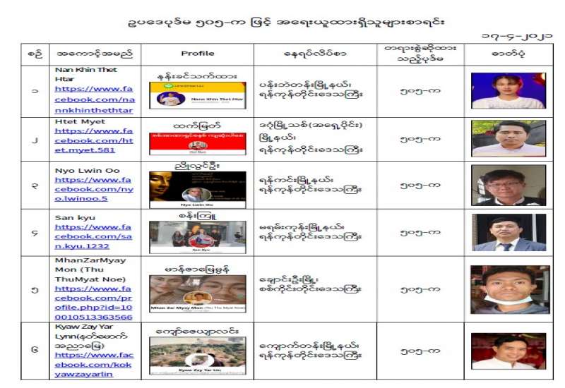 နိုင်ငံတော်၏ အုပ်ချုပ်မှုယန္တရားပျက်ပြားစေရန်ရည်ရွက်ချက်ဖြင့် နိုင်ငံ့ဝန်ထမ်းများအား CDM လှုပ်ရှား မှုတွင် ပါဝင်စေရန်လှုံ့ဆော်ခြင်း၊ CRPH မတရားအသင်းအား ထောက်ခံသည့် အကြောင်းအရာများ၊ မမှန်သတင်းများအားဖြန့်ဝေခြင်း၊ နိုင်ငံတော်တည်ငြိမ်အေးချမ်းမှုကို ပျက်ပြားစေပြီး ဆူပူအုံကြွမှုဖြစ် ပေါ်စေရန်နှင့် အများပြည်သူအထိတ်တလန့်ဖြစ်စေရန် အတွက် သွေးထိုးလှုံ့ဆော်မှုများပြုလုပ်ခြင်း၊ Social Pumishment ပြုလုပ်ခြင်းများကို လူမှုကွန်ရက် စာမျက်နှာများတွင် ရည်ရွယ်ချက်ရှိရှိ ဖြင့်ဖော် ပြခြင်းနှင့် ဖြန့်ဝေခြင်းများ ဆောင်ရွက် လျက်ရှိသည့် အောက်ဖော်ပြပါ အနုပညာရှင်အချို့နှင့် အခြား ပါဝင် ပတ်သက်သူများအား ရာဇသတ်ကြီးပုဒ်မ ၅၀၅-က ဖြင့် အမှုဖွင့်အရေးယူ ဆောင်ရွက် လျက်ရှိပါသည်။
