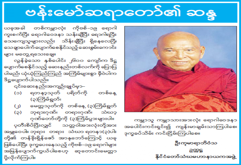 ဥပ္ပါတသန္တိစေတီတော်မြတ်ကြီးဂေါပကအဖွဲ့၏ ဩဝါဒါစရိယ၊ နေပြည်တော်၊ ပျဉ်းမနားမြို့နယ်၊ ပါဠိတက္ကသိုလ်မင်္ဂလာဇေယျုံကျောင်းတိုက်၊ ပဓာနနာယကဆရာတော် အဂ္ဂမဟာပဏ္ဍိတ၊ အဂ္ဂမဟာ သဒ္ဓမ္မဇောတိကဓဇ၊ ဘဒ္ဒန္တဝိမလဗုဒ္ဓိ မထေရ်မြတ်ကြီး အမှူးပြု သော ဆရာတော်ကြီးများသည် ယနေ့နံနက်ပိုင်းတွင် ပြည်ထောင်စုနယ်မြေ၊ နေပြည် တော်ဝေဟင်၌ ရဟတ်ယာဉ်ဖြင့် လှည့်လည်၍ အန္တရာယ်ကင်းပရိတ်တရားတော်များ ရွတ်ဖတ်ပူဇော်ကြသည်။