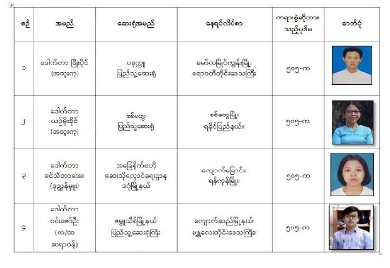နိုင်ငံတော်၏ အုပ်ချုပ်မှုယန္တရားပျက်ပြားစေရန်ရည်ရွက်ချက်ဖြင့် နိုင်ငံ့ဝန်ထမ်းများအား CDM လှုပ်ရှားမှုတွင် ပါဝင်စေရန်လှုံ့ဆော်ခြင်း၊ CRPH မတရားအသင်းအား ထောက်ခံသည့် အကြောင်းအရာများ၊ မမှန်သတင်းများအား ဖြန့်ဝေခြင်း၊ နိုင်ငံတော်တည်ငြိမ်အေးချမ်းမှုကို ပျက်ပြားစေပြီး ဆူပူအုံကြွမှုဖြစ်ပေါ်စေရန်နှင့် အများပြည်သူ အထိတ် တလန့်ဖြစ်စေရန် အတွက် သွေးထိုးလှုံ့ဆော်မှုများပြုလုပ်ခြင်း၊ Social Pumishment ပြုလုပ်ခြင်းများကို လူမှုကွန်ရက် စာမျက်နှာများတွင် ရည်ရွယ်ချက်ရှိရှိ ဖြင့်ဖော်ပြခြင်းနှင့် ဖြန့်ဝေခြင်းများ ဆောင်ရွက် လျက်ရှိသည့် အောက်ဖော်ပြပါ အနုပညာရှင်အချို့နှင့် အခြားပါဝင်ပတ်သက်သူများအား ရာဇသတ်ကြီးပုဒ်မ ၅၀၅-က ဖြင့် အမှုဖွင့်အရေးယူ ဆောင်ရွက်လျက်ရှိပါသည်။