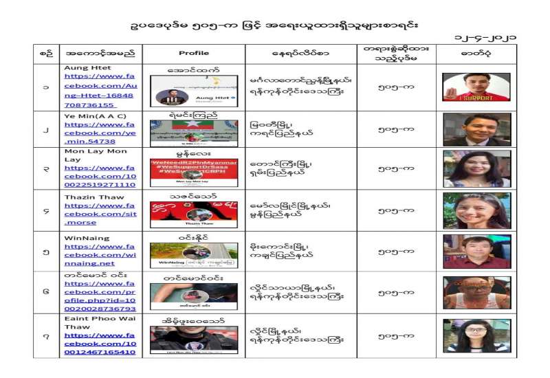 နိုင်ငံတော်၏ အုပ်ချုပ်မှုယန္တရားပျက်ပြားစေရန်ရည်ရွက်ချက်ဖြင့် နိုင်ငံ့ဝန်ထမ်းများအား CDM လှုပ်ရှားမှုတွင် ပါဝင်စေရန်လှုံ့ဆော်ခြင်း၊ CRPH မတရားအသင်းအား ထောက်ခံသည့် အကြောင်းအရာများ၊ မမှန်သတင်းများအားဖြန့်ဝေခြင်း၊ နိုင်ငံတော်တည်ငြိမ်အေးချမ်းမှုကို ပျက်ပြားစေပြီး ဆူပူအုံကြွမှုဖြစ်ပေါ်စေရန်နှင့် အများပြည်သူအထိတ်တလန့်ဖြစ်စေရန် အတွက် သွေးထိုးလှုံ့ဆော်မှုများပြုလုပ်ခြင်း၊ Social Pumishment ပြုလုပ်ခြင်းများကို လူမှုကွန်ရက် စာမျက်နှာများတွင် ရည်ရွယ်ချက်ရှိရှိ ဖြင့်ဖော်ပြခြင်းနှင့် ဖြန့်ဝေခြင်းများ ဆောင်ရွက် လျက်ရှိသည့် အောက်ဖော်ပြပါ အနုပညာရှင်အချို့နှင့် အခြားပါဝင်ပတ်သက်သူများအား ရာဇသတ်ကြီးပုဒ်မ ၅၀၅-က ဖြင့် အမှုဖွင့်အရေးယူ ဆောင်ရွက်လျက်ရှိပါသည်။