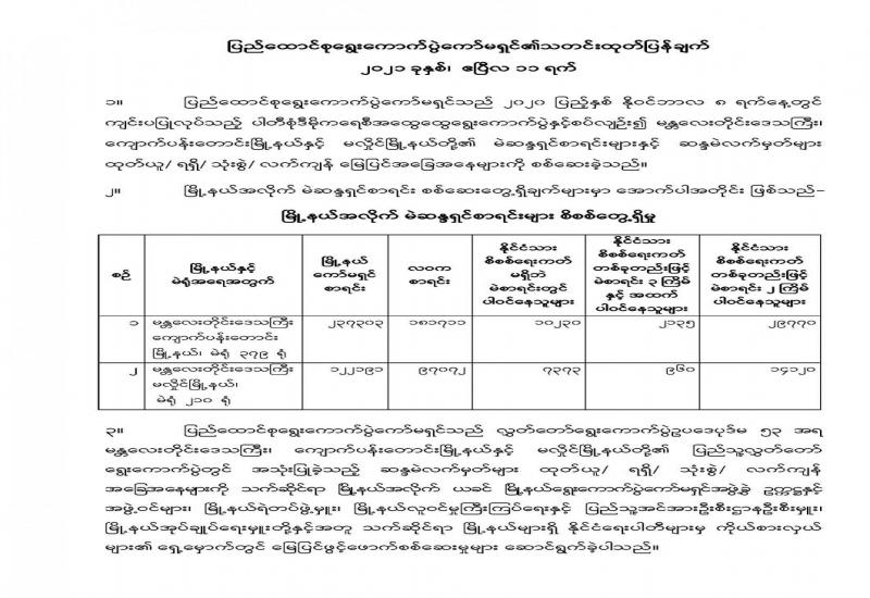 ၁၀။ ပြည်ထောင်စုရွေးကောက်ပွဲကော်မရှင် အဖွဲ့ဝင် ဦးခင်မောင်ဦးက ဆက်လက်ရှင်းလင်းရာ တွင် ၂၀၂၀ ပြည့်နှစ်အထွေထွေရွေးကောက်ပွဲတွင် သက်ဆိုင်ရာ မြို့နယ်ကော်မရှင်အဖွဲ့ခွဲများ အသုံး ပြုခဲ့သည့် နောက်ဆုံး မဲစာရင်း soft copy များကို ရယူပြီးနောက် ပြည်ထောင်စုရွေးကောက်ပွဲကော် မရှင်က စိစစ်ထုတ်ပြန်လျက်ရှိရာ ၂၀၂၁ ခုနှစ်၊ ဖေဖော်ဝါရီလ ၁၆ ရက်နေ့မှ ဧပြီလ ၈ ရက်နေ့အထိ ထုတ်ပြန်ပြီးစီးမှုများအရ တိုင်းဒေသကြီး/ပြည်နယ် နှင့် ပြည်ထောင်စုနယ်မြေ ၁၁ ခုရှိ မြို့နယ်ပေါင်း ၁၀၆ မြို့ နယ်၊ မဲရုံပေါင်း ၁၄၂၁၄ ရုံကို စိစစ်ခဲ့ရာ မြို့နယ်ကော်မရှင် စာရင်းအရ မဲဆန္ဒရှင် ၁၄၄၈၅၃၃၀ ဦးဖြစ်သော်လည်း လဝကစာရင်းအရ ၁၁၁၁၁၈၁၆ ဦးသာရှိပြီး ၃၃၇၃၅၁၄ ဦးကွာခြားမှု ရှိကြောင်း၊ ၎င်းတို့အနက်နိုင်ငံသားစိစစ်ရေးကတ်မရှိဘဲ မဲစာရင်းတွင် ပါဝင်နေသူ ၁၅၅၄၁၅၇ ဦး နိုင်ငံသားစိစစ်ရေး ကတ်တစ်ခုတည်းဖြင့် မဲစာရင်း ၃ ကြိမ်နှင့်အထက်ပါဝင်နေသူ ၁၁၁၂၃၉ ဦး နိုင်ငံသားစိစစ်ရေးကတ် တစ်ခုတည်းဖြင့် မဲစာရင်း ၂ ကြိမ်ပါဝင်သူ ၁၁၁၈၇၈၇ ဦး၊ စိစစ်ရေးကတ်မရှိဘဲ မဲစာရင်းတွင် ပါဝင်နေသူနှင့် မဲစာရင်းထပ်နေသူ စုစုပေါင်း ၂၇၈၄၁၈၃ ဦးရှိသည်ကို တွေ့ရှိရပြီး ရာခိုင်နှုန်းအားဖြင့် မဲဆန္ဒရှင်၏ ၁၉ ဒသမ ၂ ရာခိုင်နှုန်းဖြစ်ကြောင်း၊ ယခုစစ်ဆေးထုတ်ပြန်မှုများ သည် မြို့နယ်တစ်ခုချင်းအလိုက် စိစစ်တွေ့ရှိမှုများ သာဖြစ်ပြီး အခြားတိုင်းဒေသကြီး/ ခရိုင်/မြို့နယ် များနှင့် တိုက်ဆိုင်စစ်ဆေးမှု (Cross Check) များ ပါဝင်ပါက တပ်မတော်သတင်းမှန် ပြန်ကြားရေးအဖွဲ့ က မြို့နယ် ၃၁၅ မြို့နယ်၏ မဲစာရင်း CD PDF များကို အခြေခံထုတ်ပြန်ခဲ့သည့် မဲမသမာမှု ပြုနိုင်/ ဖြစ်နိုင်သည့် အရေအတွက် ၁၀၄၈၂၁၁၆ ဦး ရာခိုင် နှုန်း ၂၈ ဒသမ ၁၇ ရာခိုင်နှုန်းထက် ပိုမိုများပြားနိုင် သည်ကို စိစစ်တွေ့ရှိရပါကြောင်း ဖော်ပြပါ မြို့နယ် ၁၀၆ မြို့နယ်၏ မဲဆန္ဒရှင်စာရင်းများအပေါ် တပ်မတော် စိစစ်ချက်များနှင့် ပြည်ထောင်စုရွေးကောက်ပွဲကော်မရှင်၏ စိစစ် တွေ့ရှိချက်များကို နှိုင်းယှဉ်ရာတွင်လည်း စိစစ်သည့် အခြေခံမဲဆန္ဒရှင် စာရင်း ကွာခြားချက်အရ ကော်မရှင်၏ စိစစ်တွေ့ရှိ မှု အရေအတွက်ကကိုင်ဆောင်လက်မှတ်တစ်မျိုးမျိုး (မှတ်ပုံတင်) မရှိဘဲ မဲစာရင်းတွင် ပါဝင်နေသူ ၆၃၉၂၇ ဦး၊ တစ်ကြိမ်ထက်ပို၍ မဲစာရင်းတွင် ပါဝင် သူ (ထပ်နေသော မဲစာရင်း) ၃၅၈၀၁၈ ဦး ပိုမို စိစစ်တွေ့ရှိရပါကြောင်း၊ ယခုဆက်လက်ပြီး ၂ဝ၂ဝ ပြည့်နှစ် အထွေထွေရွေးကောက်ပွဲတွင် အသုံးပြုခဲ့သည့် ဆန္ဒမဲလက်မှတ်များကို မြေပြင်ကွင်းဆင်းစစ်ဆေးပြီး ထုတ်ပြန်လျက်ရှိမှု အခြေ အနေများကို တင်ပြမှာဖြစ်ပါကြောင်း၊ ပြည်ထော င်စုရွေးကောက်ပွဲကော်မရှင် အနေဖြင့် ၂၀၂၁ ခုနှစ်၊ ဖေဖော်ဝါရီလ ၂၄ ရက်နေ့မှ