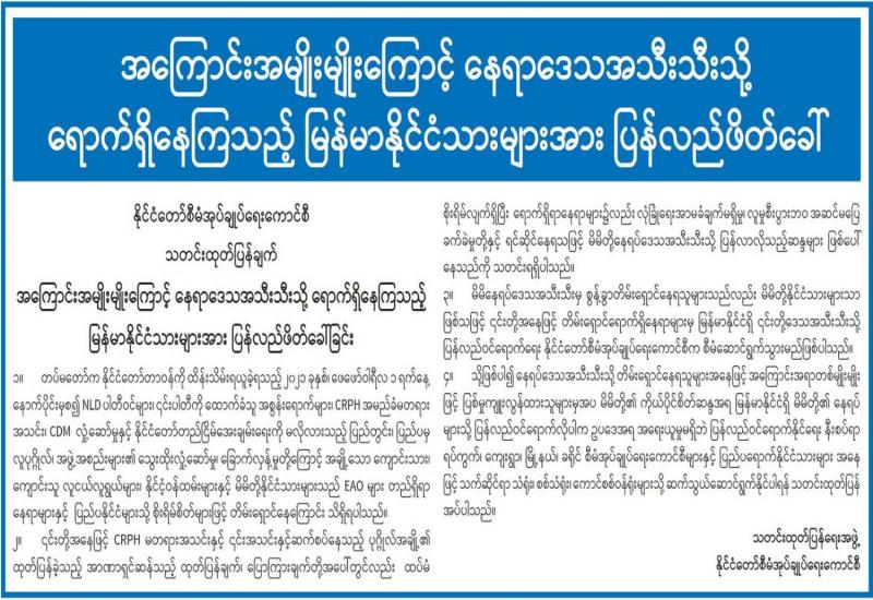 နိုင်ငံတော်၏ အုပ်ချုပ်မှုယန္တရားပျက်ပြားစေရန်ရည်ရွက်ချက်ဖြင့် နိုင်ငံ့ဝန်ထမ်းများအား CDM လှုပ်ရှားမှုတွင် ပါဝင်စေရန်လှုံ့ဆော်ခြင်း၊ CRPH မတရားအသင်းအား ထောက်ခံသည့် အကြောင်းအရာများ၊ မမှန်သတင်းများအား ဖြန့်ဝေခြင်း၊ နိုင်ငံတော်တည်ငြိမ်အေးချမ်းမှုကို ပျက်ပြားစေပြီး ဆူပူအုံကြွမှုဖြစ်ပေါ်စေရန်နှင့် အများပြည်သူအထိတ်တလန့်ဖြစ်စေရန် အတွက် သွေးထိုးလှုံ့ဆော်မှုများပြုလုပ်ခြင်း၊ Social Pumishment ပြုလုပ်ခြင်းများကို လူမှုကွန်ရက် စာမျက်နှာများတွင် ရည်ရွယ်ချက်ရှိရှိ ဖြင့်ဖော်ပြခြင်းနှင့် ဖြန့်ဝေခြင်းများ ဆောင်ရွက် လျက်ရှိသူ များအား ရာဇသတ်ကြီးပုဒ်မ ၅၀၅-က ဖြင့် အမှုဖွင့်အရေးယူနိုင်ရေး သတင်းထုတ်ပြန် ဆောင်ရွက်လျက်ရှိသည်။