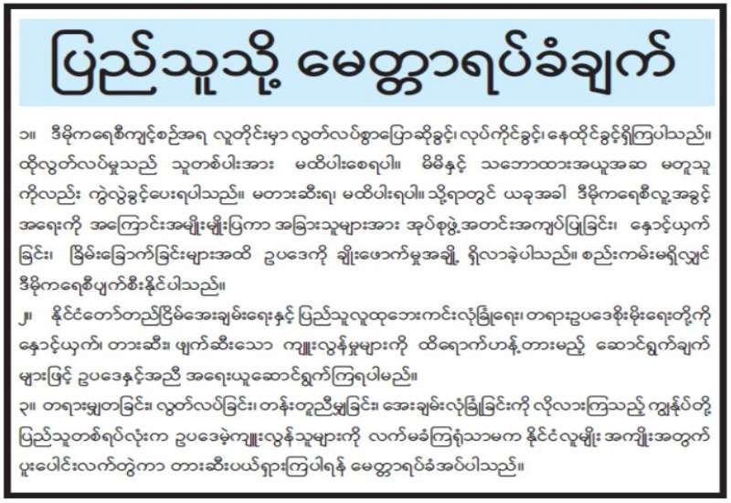 လက်ရှိအချိန်တွင် နိုင်ငံအတွင်းရှိ အချို့မြို့ကြီးများ၌ ဆူပူဆန္ဒပြမှုများ ဖြစ်ပေါ်လျက်ရှိပြီး ဆူပူလှုံ့ဆော်ဆန္ဒပြသူများအနေဖြင့် အစိုးရလုပ်ငန်းယန္တရား လည်ပတ်မှုကို အနှောင့် အယှက်ဖြစ် စေရန် လမ်းကြောင်းပိတ်ဆို့ခြင်းများ၊ ပုံမှန် လုပ်ငန်းတာဝန်ထမ်းဆောင်လျက်ရှိသည့် ဝန်ထမ်း များကို နှောင့်ယှက်ခြိမ်း ခြောက်ခြင်းများ စသည့် အဖျက်အမှောင့်လုပ်ရပ်များကို ပြုလုပ် လျက်ရှိ သည်။