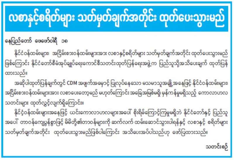 (၂၀၂၁ ခုနှစ်၊ ဖေဖော်ဝါရီလ (၁၈)ရက်နေ့ မွန်းလွဲ (၂:၀၀)နာရီအချိန် ထုတ်ပြန်ချက်)