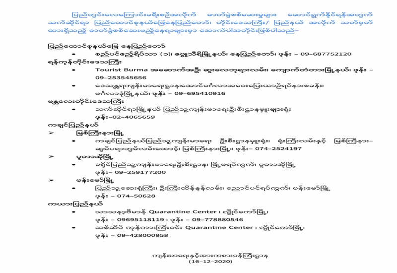 မြန်မာအမျိုးသားလေကြောင်းမှ လေကြောင်းခရီးစဉ်ကိုသာ အားထားရသော ပြည်တွင်း မြို့များကို ကျန်းမာရေးနှင့် အားကစားဝန်ကြီးဌာနမှ အတည်ပြုထုတ်ပြန်မည့် လေကြောင်းလိုင်း များနှင့် ခရီးသည်များလိုက်နာရမည့် Standard Operation Procedure (SOP)နှင့်အညီ ဒီဇင်ဘာ ၁၆ ရက်မှ စတင်ပျံသန်းပြေးဆွဲလျက်ရှိကြောင်း သိရသည်။