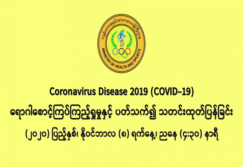 (၈-၁၁-၂၀၂၀) ရက်နေ့၊ ည (၈:၀၀) နာရီမှ (၉-၁၁-၂၀၂၀) ရက်နေ့၊ ည (၈:၀၀) နာရီအတွင်း ဓာတ်ခွဲနမူနာ စုစုပေါင်း (၉,၂၃၀) ခုအား စစ်ဆေးပြီးစီးခဲ့ရာ COVID-19 ရောဂါ ဓာတ်ခွဲအတည်ပြု လူနာသစ်(၅၉၈) ဦး တွေ့ရှိရပါသည်။