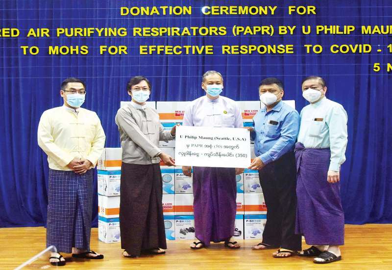 ကျန်းမာရေးနှင့်အားကစားဝန်ကြီးဌာန၊ ရန်ကုန်ပြည်သူ့ ဆေးရုံကြီးနှင့် ရန်ကုန် ခုတင် ၅၀၀ အထူးကုဆေးရုံကြီးသို့ အလှူရှင် အမေရိကန်နိုင်ငံ Seattle မြို့နေ Hissho Sushi ၏ တည်ထောင်သူ Mr. Philip Maung မှ Powered Air-purifying Respirator (PAPR)များ ပေးအပ် လှူဒါန်းပွဲ အခမ်းအနားကို ယနေ့ ညနေ ၃နာရီခွဲက ရန်ကုန်မြို့ ဒဂုံမြို့နယ် ဇီဝကလမ်း အမှတ်(၅)ရှိ ဆေးသုတေသနဦးစီးဌာန(ရုံးချုပ်) အစည်းအဝေးခန်းမ၌ ပြုလုပ်သည်။