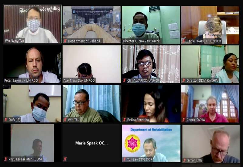 ကချင်ပြည်နယ်အတွင်းရှိ နေရပ်စွန့်ခွာရသူများ (IDPs) ပြန်လည်နေရာချမှု အကောင်အထည် ဖော်ရေးဆိုင်ရာ လုပ်ငန်းများ ဆောင်ရွက်ရာတွင် UN Agency များ၏ ကဏ္ဍအလိုက် ညှိနှိုင်းမှု သေချာစေရေးအတွက် နည်းပညာဆိုင်ရာ ညှိနှိုင်းရေးအဖွဲ့၏ လုပ်ငန်းလမ်းညွှန် (ToR) မူကြမ်း ရေးဆွဲနိုင်ရေးအတွက် ညှိနှိုင်းအစည်းအဝေးအား ယနေ့ညနေပိုင်းတွင် ဗီဒီယိုကွန်ဖရင့်ဖြင့် ကျင်းပ သည်။