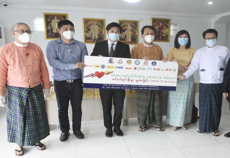 ရန်ကုန်တိုင်းဒေသကြီးအစိုးရအဖွဲ့သို့ ထိုင်းနိုင်ငံစီးပွားရေးလုပ်ငန်းရှင်များနှင့် ပြည်သူ များက ကိုဗစ် - ၁၉ ရောဂါ ကာကွယ်ရေးပစ္စည်းများ ပေးအပ်လှူဒါန်းပွဲ အခမ်းအနားကို နိုဝင်ဘာ ၅ ရက် နံနက်ပိုင်းက ရန်ကုန်မြို့ သင်္ဃန်းကျွန်း မြို့နယ်ရှိ မြန်မာ - ထိုင်းကုန်သည်များနှင့် စက်မှုလက်မှု လုပ်ငန်းရှင်များ အသင်းရုံး၌ ပြုလုပ်သည်။