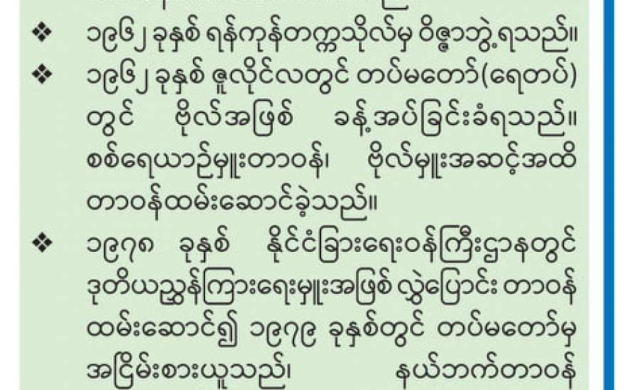 ရာပြည့်တက္ကသိုလ်အကြောင်း စဉ်းစားလိုက်သည်နှင့် အတိတ်ပုံရိပ်တို့က တိုးဝှေ့၍ ဝင်လာခဲ့ပေပြီ။ တက္ကသိုလ်တက်ခဲ့စဉ်ကာလတစ်လျှောက် လွတ်လပ်ပေါ့ပါးပျော်ရွှင်စွာ ပညာဆည်းပူး ခွင့်ရခဲ့တာတွေ၊ သူငယ်ချင်းများနဲ့ စာအကြောင်းပေအကြောင်း ဆွေးနွေးခဲ့ကြ၊ ငြင်းခဲ့ကြ ခုန်ခဲ့ကြရတာတွေဟာလည်း မမေ့နိုင်စရာအတိတ်ပုံရိပ်တွေပေါ့လေ။ ဆရာကြီး ဆရာမကြီးတွေက စာအုပ်စာပေတွေများ ညွှန်းလိုက်ပြီဆိုရင် ရန်ကုန်တက္ကသိုလ်စာကြည့်တိုက်ဆီကို အပြေးအလွှား ချီတက်ကြရစမြဲပင်။ ယနေ့ခေတ်လို အင်တာနက်က ရှာလို့ဖွေလို့ ရတဲ့ခေတ်လည်း မဟုတ်ခဲ့၊ ကိုယ်လိုချင်တဲ့စာကို မိတ္တူကူးဆိုင်မှာ လွယ်လွယ်သွားကူးလို့ရခဲ့တဲ့ အနေအထားမျိုးလည်း မဟုတ်တော့ စာရှာခြင်း၊ စာကူးခြင်းနဲ့ စာဆွေးနွေးကြခြင်းသည် ကျွန်မတို့အတွက်တော့ အသက်တမျှတန်ဖိုးထားရသော အတိတ်ပုံရိပ်များပင် မဟုတ်ပါလား။