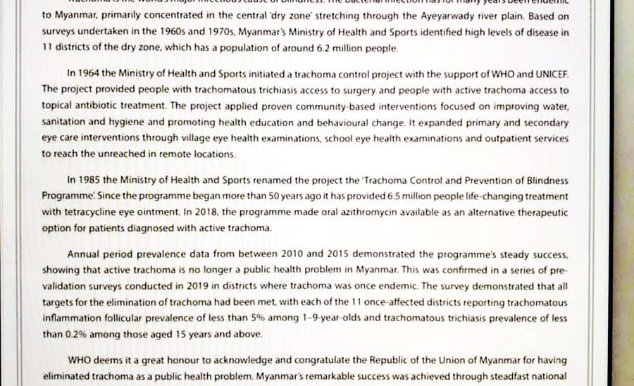 ၂၀၂၀ ပြည့်နှစ် စက်တင်ဘာလ ၁၀ ရက်နေ့သည် နိုင်ငံတော်အစိုးရနှင့် မိမိတို့ဝန်ကြီးဌာနနှင့် မျက်စိရောဂါကုသ ပေးလျက်ရှိသော ဌာနအားလုံးအတွက် မင်္ဂလာရှိသောနေ့ရက်ဖြစ်ခဲ့ပေသည်။ အကြောင်းကား စက်တင်ဘာလ ၉ ရက်နေ့မှစတင်ကျင်းပသော ကမ္ဘာ့ကျန်းမာရေးအဖွဲ့ အရှေ့တောင်အာရှ ဒေသဆိုင်ရာကော်မတီ၏ (၇၃) ကြိမ်မြောက် အစည်းအဝေး၏ ဒုတိယ မြောက်နေ့ဖြစ်သော ဤနေ့တွင် အရှေ့တောင်အာရှဒေသများအတွင်း ပြည်သူ့ကျန်းမာရေးဆိုင်ရာ ထူးချွန်ပြောင်မြောက်အောင်မြင်စွာ ဆောင်ရွက်နိုင်ခဲ့မှုများအတွက် အသိအမှတ်ပြု ဂုဏ်ပြုမှတ်တမ်းချီးမြှင့်ပေးအပ်ပွဲကို ကျင်းပခဲ့ရာ မြန်မာနိုင်ငံတွင် မျက်ခမ်းစပ်ရောဂါအား ပြည်သူ့ကျန်းမာရေးပြဿနာအဖြစ်မှ ကင်းဝေးအောင် ဆောင်ရွက်နိုင်ခဲ့သည့်အတွက် ကမ္ဘာ့ ကျန်းမာရေးအဖွဲ့ အရှေ့တောင်အာရှဒေသဆိုင်ရာ ညွှန်ကြားရေးမှူး Mrs. Poonan Khetrapal Singh က မြန်မာနိုင်ငံတွင် မျက်ခမ်းစပ်ရောဂါကင်းဝေးကြောင်း အသိအမှတ်ပြု ဂုဏ်ပြု မှတ်တမ်းလွှာကို ပေးအပ်သဖြင့် ပြည်ထောင်စုဝန်ကြီး ဒေါက်တာမြင့်ထွေးက လက်ခံရယူ ခဲ့သည်။