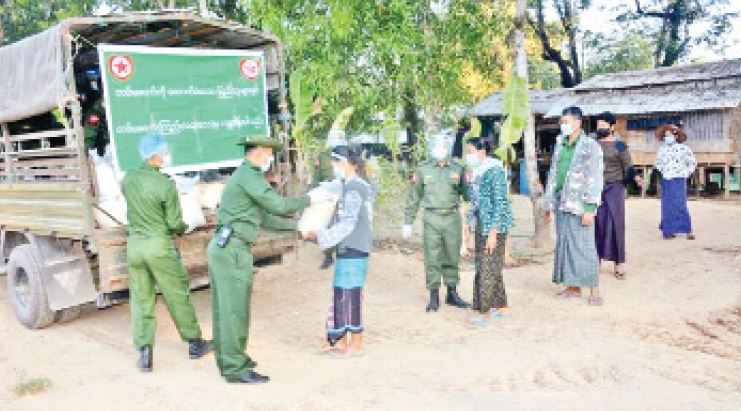 ကိုဗစ်-၁၉ ရောဂါ ကာကွယ်၊ ထိန်းချုပ်၊ ကုသမှုလုပ်ငန်းများ ဆောင်ရွက်နေစဉ်ကာလအတွင်း သွားလာမှုကန့်သတ်ချက်များကြောင့် ဒေသခံပြည်သူများ စားရေးအဆင်ပြေစေရန်အတွက် နယ်မြေခံတပ်မတော်သားများက ဆန်၊ ဆီနှင့် စားသောက်ဖွယ်ရာများကို အိမ်အရောက် လိုက်လံပေးဝေ လှူဒါန်းလျက်ရှိသည်။