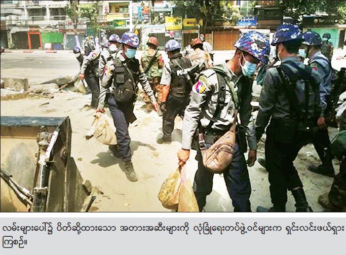 ရန်ကုန်တိုင်းဒေသကြီး လှိုင်မြို့နယ်တွင် လုံခြုံရေးတပ်ဖွဲ့ဝင်များက ဆူပူအကြမ်းဖက်သူများ တားဆီးပိတ်ဆို့ထားသော အတားအဆီးများကို ရှင်းလင်းဖယ်ရှား