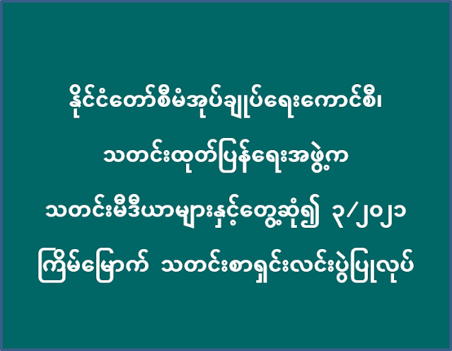 နိုင်ငံတော်စီမံအုပ်ချုပ်ရေးကောင်စီ၊ သတင်းထုတ်ပြန်ရေးအဖွဲ့၏ ၃/၂၀၂၁ ကြိမ် မြောက် သတင်းစာရှင်းလင်းပွဲကို ယနေ့မွန်းလွဲပိုင်းတွင် ပြန်ကြားရေးဝန်ကြီး ဌာန၌ကျင်းပပြုလုပ်ပြီး နိုင်ငံတော်စီမံအုပ်ချုပ်ရေးကောင်စီ၊ သတင်းထုတ်ပြန်ရေး အဖွဲ့ ခေါင်းဆောင် ဗိုလ်မှူးချုပ် ဇော်မင်းထွန်း၊ ပြည်ထောင်စုရွေးကောက်ပွဲ ကော်မရှင် အဖွဲ့ဝင် ဦးခင်မောင်ဦးနှင့် ဌာနဆိုင်ရာသတင်းထုတ်ပြန်ရေးအဖွဲ့ ကိုယ်စားလှယ်များက သတင်းမီဒီယာများ၏ သိရှိလိုသည့်မေးမြန်းမှုများကို ပြန်လည်ဖြေကြားသည်။