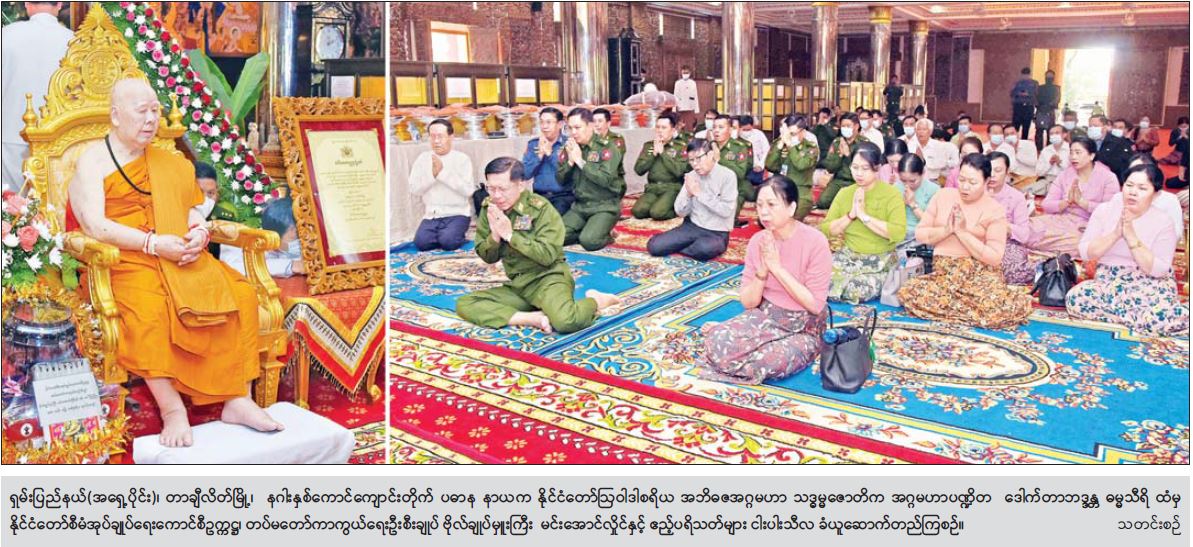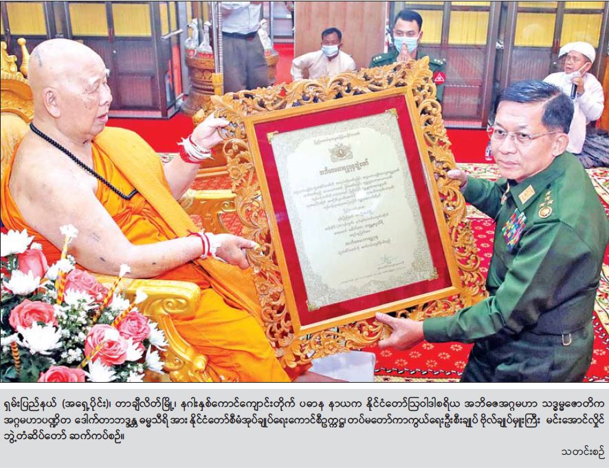 နေပြည်တော် မတ် ၂၈ ၂၀၂၁ ခုနှစ် သာသနာတော်ဆိုင်ရာ ဘွဲ့တံဆိပ် တော်များ ဆက်ကပ်ပူဇော်ပွဲ မဟာမင်္ဂလာ အခမ်း အနားကို မတ် ၂၇ ရက်တွင် နေပြည်တော် ဥပ္ပါတ သန္တိစေတီတော် ပရိဝုဏ်အတွင်းရှိ သာသနာ့မဟာ ဗိမာန်တော်ကြီး၌ကျင်းပခဲ့ပြီး ကျန်းမာရေး အခက်အခဲကြောင့် ဘွဲ့တံဆိပ်တော် များ ဆက်ကပ်ပူဇော်ပွဲသို့ တက်ရောက်နိုင်ခြင်းမရှိသည့် ဆရာတော်ကြီးများကို သက်ဆိုင်ရာ နယ်မြေများအလိုက် တာဝန် ရှိသူများက သွားရောက်ဆက်ကပ် ပူဇော်လျက် ရှိသည်။ ဘွဲ့တံဆိပ် ဆက်ကပ်ပူဇော်ခံရသည့် ဆရာတော် ကြီးတစ်ပါးဖြစ်သည့် ရှမ်းပြည်နယ် (အရှေ့ပိုင်း)၊ တာချီလိတ်မြို့၊ နဂါးနှစ်ကောင်ကျောင်းတိုက် ပဓာန နာယက နိုင်ငံတော်ဩဝါဒါ စရိယ အဘိဓဇအဂ္ဂမဟာ သဒ္ဓမ္မဇောတိက အဂ္ဂမဟာပဏ္ဍိတ ဒေါက်တာ ဘဒ္ဓန္တဓမ္မသီရိအား ၂၀၂၁ ခုနှစ်၊ အဘိဓဇမဟာရဋ္ဌဂုရု ဘွဲ့တံဆိပ်တော် ဆက်ကပ်ပူဇော်ပွဲ မဟာမင်္ဂလာ အခမ်းအနားကို ယနေ့နံနက်ပိုင်းတွင် နဂါးနှစ်ကောင် ကျောင်းတိုက်၌ ကျင်းပရာ နိုင်ငံတော်စီမံအုပ်ချုပ်ရေး ကောင်စီဥက္ကဋ္ဌ၊ တပ်မတော်ကာကွယ်ရေးဦးစီးချုပ် ဗိုလ်ချုပ်မှူးကြီး မင်းအောင်လှိုင် ကိုယ်တိုင် တက်ရောက်ကြည်ညို၍ဘွဲ့တံဆိပ်တော် ဆက်ကပ် ပူဇော်သည်။ အခမ်းအနားသို့ ဘွဲ့ခံဆရာတော်ကြီးဖြစ်သည့် နဂါးနှစ်ကောင်ကျောင်းတိုက် ဆရာတော်ကြီးနှင့် ကျိုင်းတုံမြို့၊ သီလဓမ္မကုန်းသာတောရကျောင်းတိုက် ဦးစီးပဓာန နာယက(ဝစီပိတ်) ဆရာတော် ဘဒ္ဓန္တကောဝိဒတို့ အမှူးပြုသည့် သံဃာတော်များ ကြွရောက်ချီးမြှင့်တော်မူကြပြီး နိုင်ငံတော်စီမံ အုပ်ချုပ်ရေးကောင်စီဥက္ကဋ္ဌ တပ်မတော်ကာကွယ် ရေးဦးစီးချုပ်နှင့်ဇနီးတို့နှင့်အတူ ကောင်စီဝင် များဖြစ်ကြသည့် ဒုတိယဗိုလ်ချုပ်ကြီး မိုးမြင့်ထွန်း၊ ဦးစိုင်းလုံးဆိုင်၊ ကောင်စီတွဲဖက် အတွင်းရေးမှူး ဒုတိယဗိုလ်ချုပ်ကြီး ရဲဝင်းဦးနှင့်ဇနီး၊ သာသနာရေးနှင့်ယဉ်ကျေးမှုဝန်ကြီးဌာန ပြည်ထောင်စုဝန်ကြီး ဦးကိုကို၊ ကာကွယ်ရေးဦးစီးချုပ်(ရေ)နှင့်ဇနီး၊ ကာကွယ်ရေးဦးစီးချုပ်ရုံးမှ တပ်မတော်အရာရှိကြီး များနှင့် ဇနီးများ၊ တြိဂံဒေသတိုင်းစစ်ဌာနချုပ်တိုင်းမှူး ဗိုလ်မှူးချုပ် မျိုးမင်းထွန်း၊ တာချီလိတ်ခရိုင်၊ ခရိုင်စီမံအုပ်ချုပ်ရေးအဖွဲ့ဥက္ကဋ္ဌနှင့် ဖိတ်ကြားထားသူများ တက်ရောက်ကြသည်။ သာသနာရေးဆိုင်ရာများ လျှောက်ထား အခမ်းအနားကို နမောတဿ သုံးကြိမ်ရွတ်ဆို ဘုရားကန်တော့၍ ဖွင့်လှစ်ပြီး နဂါးနှစ်ကောင် ကျောင်းတိုက် ဆရာတော်ကြီးထံမှ နိုင်ငံတော်စီမံ အုပ်ချုပ်ရေးကောင်စီဥက္ကဋ္ဌ၊ တပ်မတော် ကာကွယ်ရေး ဦးစီးချုပ်နှင့်ဇနီးနှင့် ဧည့်ပရိသတ်တို့က ငါးပါးသီလ ခံယူဆောက်တည်ကြသည်။ ထို့နောက် သာသနာ ရေးနှင့် ယဉ်ကျေးမှုဝန်ကြီးဌာန ပြည်ထောင်စုဝန်ကြီး ဦးကိုကိုက သာသနာရေးဆိ