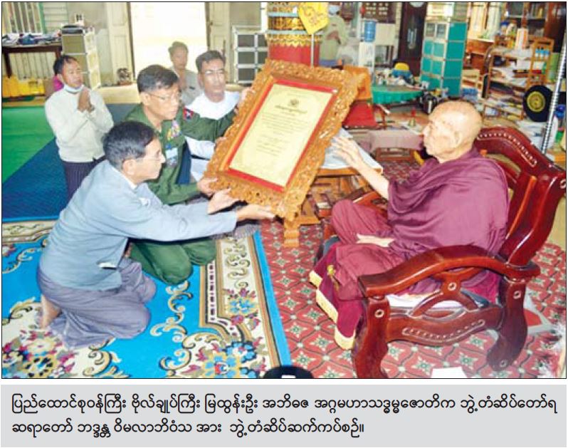 ထို့အတူ ၂၀၂၁ ခုနှစ်၊ သာသနာတော်ဆိုင်ရာ ဘွဲ့တံဆိပ်တော်များ ဆက်ကပ်ပူဇော်ပွဲ မဟာမင်္ဂလာအခမ်းအနားသို့ ဘွဲ့တံဆိပ်တော်ယူရန် ကြွရောက်နိုင်ခြင်းမရှိသော ရန်ကုန်တိုင်း ဒေသကြီး အင်းစိန်မြို့နယ်ရှိ KWEKABAW ဆေးရုံတွင် တက်ရောက်ဆေးကုသမှု ခံယူ လျက်ရှိသည့် ပဲခူးတိုင်းဒေသကြီး မင်းလှမြို့နယ် သာယာကုန်းကျေးရွာ သုံးထပ်ကျောင်းတိုက် ဦးစီးပဓာနနာယက၊ အဂ္ဂမဟာ ပဏ္ဍိတ၊ အဘိဓဇမဟာရဋ္ဌဂုရု၊ ဘဒ္ဒန္တပဏ္ဍိတ အား ယနေ့ နေ့လယ်ပိုင်းတွင် ရန်ကုန်တိုင်း စစ်ဌာနချုပ်တိုင်းမှူးနှင့် အဖွဲ့ဝင် များက သွားရောက်ဖူးမြော် ကြည်ညို၊ ကာ အဘိဓဇအဂ္ဂမဟာ သဒ္ဓမ္မဇောတိက ဘွဲ့တံဆိပ်တော် နှင့် လှူဖွယ်ပစ္စည်းများအား ဆက်ကပ်လှူဒါန်းခဲ့သည်။