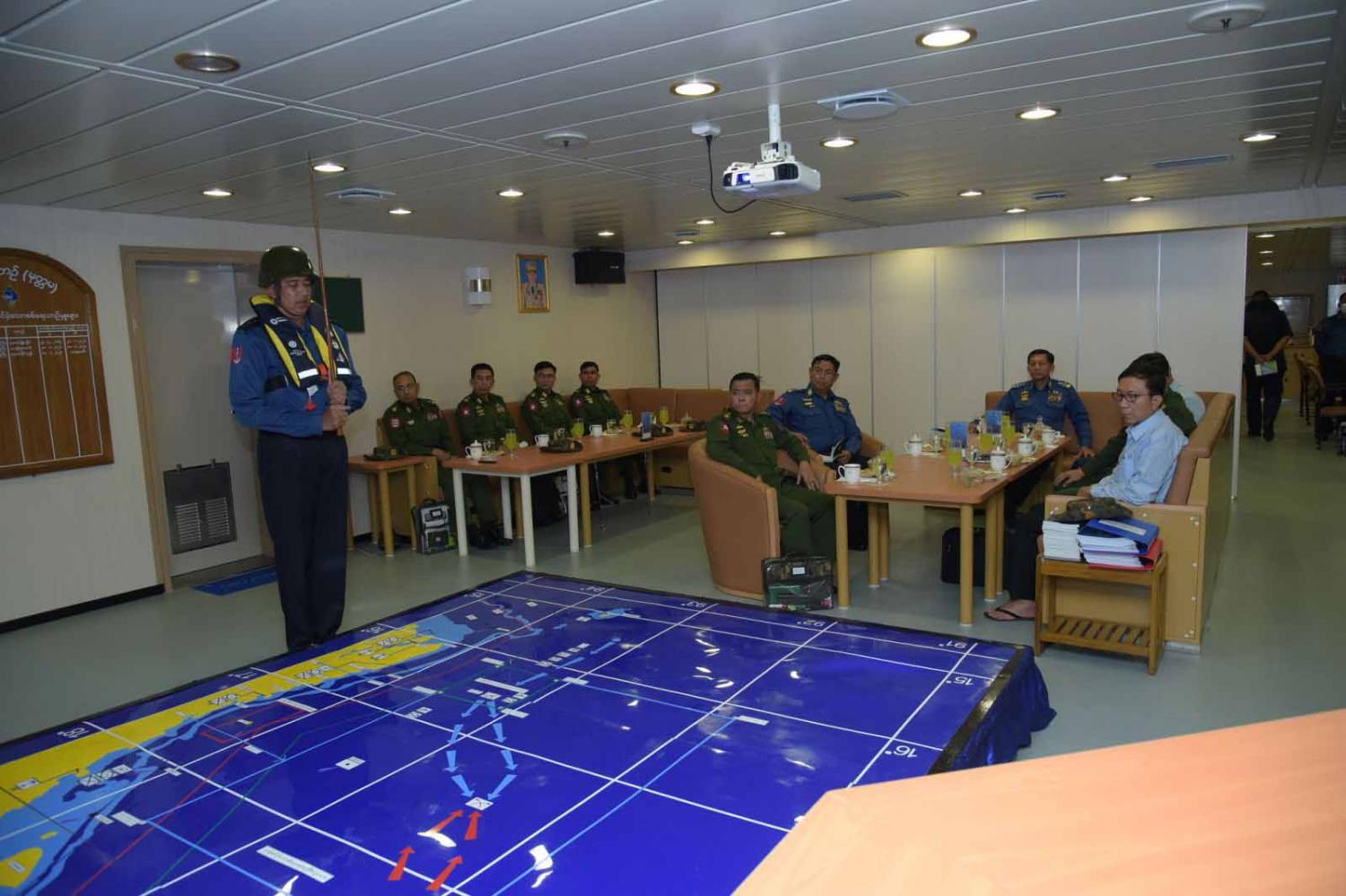 ထိုသို့ လေ့ကျင့်ဆောင်ရွက်နေမှုများအား ယနေ့တွင် နိုင်ငံတော်စီမံအုပ်ချုပ်ရေး ကောင်စီဥက္ကဋ္ဌ တပ်မတော်ကာကွယ်ရေးဦးစီးချုပ် ဗိုလ်ချုပ်မှူးကြီးမင်းအောင်လှိုင် သည် ကောင်စီအဖွဲ့ဝင် များဖြစ်ကြသည့် ဗိုလ်ချုပ်ကြီးမောင်မောင်ကျော်၊ ဒုတိယ ဗိုလ်ချုပ်ကြီး မိုးမြင့်ထွန်း၊ ကောင်စီ တွဲဖက်အတွင်းရေးမှူး ဒုတိယဗိုလ်ချုပ်ကြီး ရဲဝင်းဦး၊ စီမံကိန်း၊ ဘဏ္ဍာရေးနှင့် စက်မှုဝန်ကြီးဌာန ပြည်ထောင်စုဝန်ကြီး ဦးဝင်းရှိန်၊ ကာကွယ်ရေးဦးစီးချုပ်(ရေ) ဗိုလ်ချုပ်ကြီး မိုးအောင်၊ ကာကွယ်ရေးဦးစီးချုပ်ရုံး(ကြည်း၊ ရေ၊ လေ)မှ တပ်မတော် အရာရှိကြီးများ၊ အနောက် တောင်တိုင်းစစ်ဌာနချုပ် တိုင်းမှူး ဗိုလ်ချုပ် အောင်အောင် နှင့် တာဝန်ရှိသူများလိုက်ပါ၍ သွားရောက်ကြည့်ရှု့ စစ်ဆေး သည်။ ဦးစွာ နိုင်ငံတော်စီမံအုပ်ချုပ်ရေး ကောင်စီဥက္ကဋ္ဌ တပ်မတော်ကာကွယ်ရေးဦးစီး ချုပ်နှင့် အဖွဲ့ဝင် များသည် လေ့ကျင့်ခန်းဆောင်ရွက်နေသည့် စစ်ရေယာစဉ်များအား ကြည့်ရှုစစ်ဆေးရန် စစ်ရေ ယာစဉ်(မုတ္တမ)ပေါ်သို့ ရဟတ်ယာစဉ်ဖြင့် ဆင်းသက်ရောက်ရှိ ခဲ့ရာ (Three-Dimensional Naval Exercise-Sea Shield 2020)အား လေ့ကျင့် လျက်ရှိသည့် လေ့ကျင့်ခန်း ကြီးကြပ် ရေးမှူး(Officer Scheduling Exercise-OSE) ဗိုလ်ချုပ် ထိန်ဝင်း၊ တာဝန်ရေတပ်မမှူး ဗိုလ်မှူးကြီး တက်လွင်ထွန်းနှင့် လေ့ကျင့်ခန်း တွင်ပါဝင်သည့် အရာရှိကြီးများက ကြိုဆိုခဲ့ ကြသည်။ ထို့နောက် ကာကွယ်ရေးဦးစီး ချုပ်(ရေ)က တပ်မတော်ကာကွယ်ရေးဦးစီးချုပ်၏ လမ်းညွှန်မှာကြားချက်အတိုင်း စစ်နည်းဗျူဟာအဆင့် ဝေဟင်၊ ရေပြင်၊ ရေအောက် စစ်ဆင်မှုနှင့် ပစ်ခတ်မှု လေ့ကျင့် ခန်း (Sea Shield -2020)ကို လေ့ကျင့်ဆောင်ရွက်ရသည့် ရည်ရွယ်ချက်နှင့် ရေပြင် သွားစစ်ရေယာစဉ်များ၊ ရေငုပ်သင်္ဘောနှင့် ရဟတ်ယာစဉ်တို့အပါအဝင် စစ်မျက်နှာ သုံးဘက်မှစစ်ဆင်ခြင်း Three-Dimensional Operation လေ့ကျင့်ခဲ့မှုအခြေအနေ အား ရှင်းလင်းတင်ပြသည်။ ဆက်လက်၍ တာဝန်ရေတပ်မမှူးက လေ့ကျင့်ခန်း လက်တွေ့ ဆောင်ရွက် နေမှုများအား ရှင်းလင်းတင်ပြသည်။ ရှင်းလင်းတင်ပြမှုများ အပေါ် နိုင်ငံတော် စီမံအုပ်ချုပ်ရေးကောင်စီဥက္ကဋ္ဌ တပ်မတော်ကာကွယ်ရေးဦးစီးချုပ် က ယခုပြုလုပ်သည့် လေ့ကျင့်ခန်းသည် ပစ်ခတ်မှုလေ့ကျင့်ခန်းဖြစ်သဖြင့် ပစ်မှတ် များကို တိကျစွာထိမှန်အောင် အလေးထားလေ့ကျင့်ဆောင်ရွက်ပြီး သင်ခန်းစာ ဖော်ထုတ်ရန် လိုအပ်သည့်အခြေအနေများနှင့် လေ့ကျင့်ရေးဆိုင်ရာများလုပ်ဆောင် ရာတွင် သတင်းအချက်အလက် စုံလင်စွာရယူခြင်း၊ ပိတ်ဆို့ခြင်း၊ တားဆီးခြင်း၊ ချေမှုန်းခြင်းတို့ကို ကျယ်ကျယ်ပြန့်ပြန့်စစဉ်းစားလုပ်ဆောင်ရန် အရေးကြီးသည့် အခြေအနေများနှင့် ပတ်သက်ပြီး ပြန်လည်ဆွေးနွေး ပြောကြားသည်။ ဆက်သွယ်ဆောင်ရွက်ခဲ့ ထို့နောက် လေ့ကျင့်ခန်းမစတင်မီ စစ်ရေ