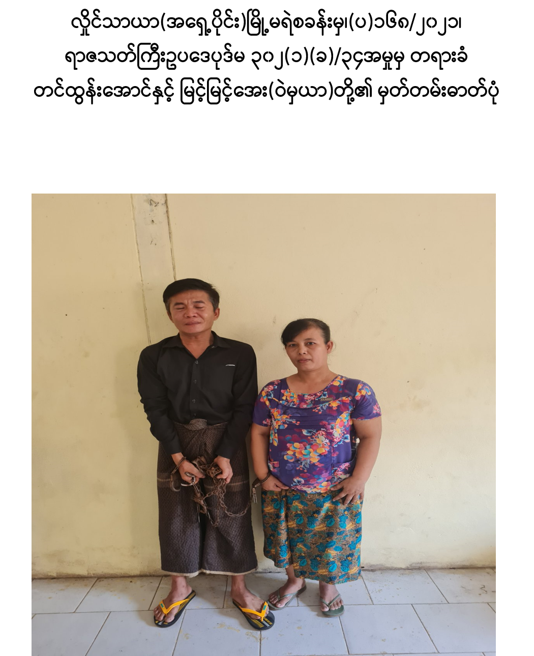 ရန်ကုန်တိုင်းဒေသကြီး၊ လှိုင်သာယာ(အရှေ့ပိုင်း)မြို့နယ်၊ အမှတ်(၇)ရက်ကွက်၊ အောင်မေတ္တာလမ်းနေ မဝင်းသန္တာဆွေ အား မတ် ၁၅ ရက်တွင် လှမျိုးအောင်(ခ) ကိုမျိုး(ခ)ဝက်ကြီး(ဘ)ဦးမြင့်လှိုင်၊ အောင်သူရဇော်(ခ)ကတုံး(ခ)သူရ(ဘ)ဦးအောင်ဇော်ဦး၊ အညာသား(ခ)မျိုးဇော်ထက်(ဘ)ဦးဝင်းခိုင်နှင့် မင်းခန့်(ခ)နှင်းကိုကို(ဘ)ဦးသောင်းတင် တို့သည် အရိုး/အသွား (၉)လက်မခန့်ရှိ ဓားဦးချွန်ဖြင် ထိုးခဲ့သဖြင့် အဆိုပါ မဝင်းသန္တာဆွေတွင် ၄ cm ခန့်အနက်ရှိ ယာရင်အုံထိုးသွင်းဒဏ်ရာ (၂)ချက်၊ ၁၂ cm ခန့်အနက်ရှိ ဝဲရင်အုံထိုးသွင်းဒဏ်ရာ (၄)ချက်၊ ၁၂ cm ဝဲခါးစောင်း ထိုးသွင်းဒဏ်ရာ များ ရရှိခဲ့ပြီး ဝဲရင်အုံးထိုးသွင်းဒဏ်ရာမှာ အဆုတ်ထိရောက်ပြီး ရင်ခေါင်းအတွင်း သွေးယို၍ သေဆုံး ခဲ့ခြင်းဖြင့် တစ်ဦးထက်ပိုသောသူမျာက အကြံတူတစ်ခုကို အထမြောက်စေရန် ပြုလုပ်သည်ခဲ့ သည့်ပြစ်မှုကို ကျူးလွန်ခဲ့သည့်အတွက် စစ်အုပ်ချုပ် ရေး (Martial Law)စစ်ခုံရုံးဖွဲ့၍ စစ်ဆေးမှုများ ဆောင်ရွက်ခဲ့ရာ ရာဇသတ်ကြီး ပုဒ်မ-၃၀၂ (၁)(ခ)/၃၄ အရ ဧပြီ ၁၂ ရက်တွင် “ သေဒဏ် ” အမိန့်ကို လည်းကောင်း၊ တင်ထွန်းအောင်(ခ)မိုးလျှံ(ဘ)ဦးထွန်းဆန်း၊ ဒေါ်မြင့်မြင့်အေး(ဘ)ဦးငွေငြိမ်း နှင့် ဒေါ်တင်တင်အေး(ဘ)ဦးငွေငြိမ်းတို့သည် မဝင်းသန္တာဆွေ အား မတ် ၁၅ ရက်တွင် လှမျိုးအောင်(ခ)ကိုမျိုး(ခ)ဝက်ကြီးနှင့် အောင်သူရဇော်(ခ)ကတုံး(ခ)သူရ တို့က အရိုး/ အသွား (၉)လက်မခန့်ရှိ ဓားဦးချွန်ဖြင် ထိုးခဲ့သဖြင့် သေဆုံးမှုဖြစ်စဉ်တွင် မဝင်းသန္တာဆွေ အား သူလျှို၊ ဒလန်၊ သတင်းပေးဟု စွပ်စွဲကာ သောင်ကြီး ဘုန်းကြီးကျောင်းသို့ ခေါ်ယူစစ်ဆေးမေးမြန်းခြင်း၊ မဝင်းသန္တဆွေ၏ နေအိမ်အား အပြင်ဘက်မှသော့ပိတ်ကာ သော့နှင့် လက်ကိုင်ဖုန်း(၂)လုံးအား သိမ်းဆည်းထား ရှိခဲ့ခြင်း၊ လှမျိုးအောင်(ခ)ကိုမျိုး(ခ)ဝက်ကြီး မှ မဝင်းသန္တာဆေွ အား ခေါ်ဆောင်သွား ရန် သော့အား လာရောက်တောင်းယူစဉ် ပေးအပ်ခဲ့ခြင်းဖြင့် မဝင်းသန္တာဆွေ အား သတ်ရန် အားပေးကူညီမှုကို ပြုလုပ်ခဲ့သည့် ပြစ်မှုကို ကျူးလွန်ခဲ့သည့်အတွက် စစ်အုပ်ချုပ်ရေး (Martial Law)စစ်ခုံရုံးဖွဲ့၍ စစ်ဆေးမှုများ ဆောင်ရွက်ခဲ့ရာ ရာဇသတ်ကြီး ပုဒ်မ-၃၀၂ (၁)(ခ)/၁၀၉ အရ ဧပြီ ၁၂ ရက်တွင် “ သေဒဏ် ”အမိန့်ကို လည်းကောင်း၊ စိုးကြီး(ခ)စိုးပိုင်(ဘ)ဦးလှစော သည် ဧရာဝတီတိုင်းဒေသကြီး၊ ကျောင်းကုန်းမြို့၌ မတ် ၁၆ ရက်နေ့ ည ၈ နာရီအချိန်ခန့်တွင် လှမျိုးအောင်(ခ) ကိုမျိုး(ခ)ဝက်ကြီးနှင့် မကြူကြူသင်း တို့အား လှိုင်သာယာ(အရှေ့ပိုင်း)မြို့နယ်၊ အမှတ်(၇)ရပ်ကွက်၊ အောင်မေတ္တာလမ်းနေ မဝင်းသန္တာဆွေ အား လူသတ်မှုကျူးလွန်ခဲ့သဖြင့် ဖမ်းဆီးစေရန် အမိန့်ထုတ်ပြန်ထားပြီး ထွက်ပြေးနေသည်ကို သိလျက်နှင့် ဖမ်းဆီးခြင်းမှ ကာကွယ်ရန်အကြံဖြင့် လက်သင့်ခံမှုကို ပြုလုပ်ခဲ့သည့် ပြစ်မှု