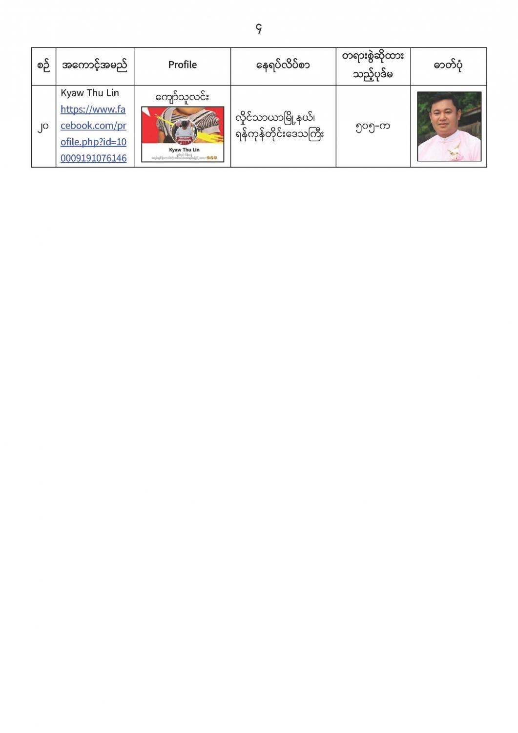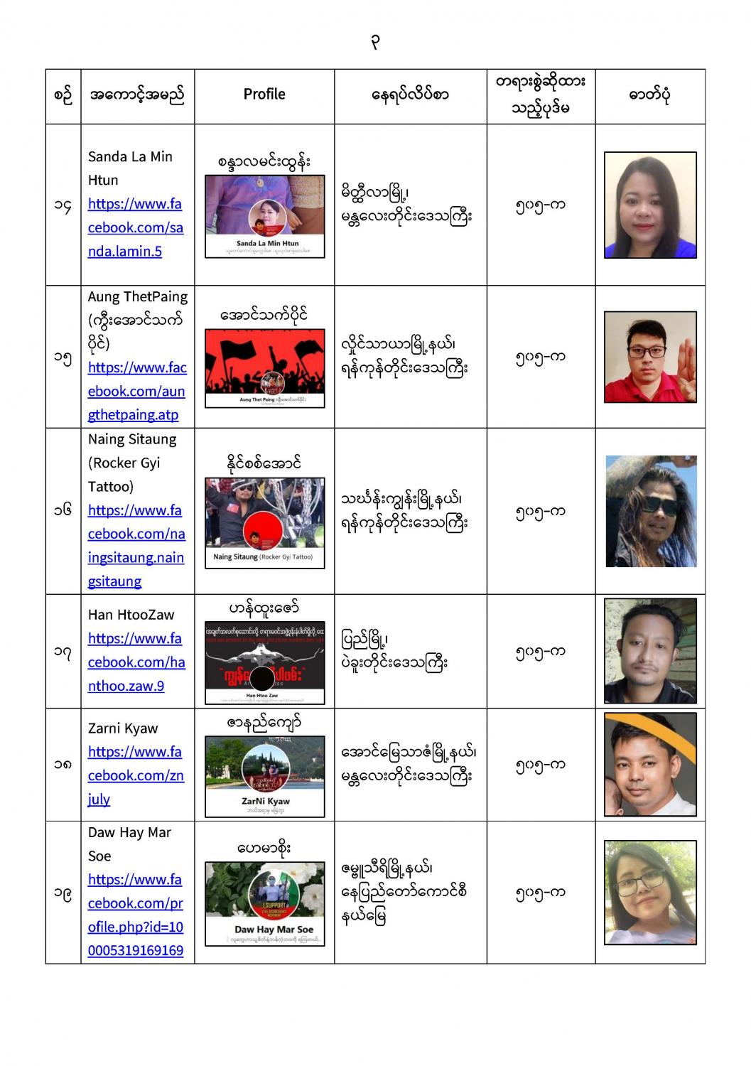 နိုင်ငံတော်၏ အုပ်ချုပ်မှုယန္တရားပျက်ပြားစေရန်ရည်ရွက်ချက်ဖြင့် နိုင်ငံ့ဝန်ထမ်းများအား CDM လှုပ်ရှားမှုတွင် ပါဝင်စေရန်လှုံ့ဆော်ခြင်း၊ CRPH မတရားအသင်းအား ထောက်ခံသည့် အကြောင်းအရာများ၊ မမှန်သတင်းများအားဖြန့်ဝေခြင်း၊ နိုင်ငံတော်တည်ငြိမ်အေးချမ်းမှုကို ပျက်ပြားစေပြီး ဆူပူအုံကြွမှုဖြစ်ပေါ်စေရန်နှင့် အများပြည်သူအထိတ်တလန့်ဖြစ်စေရန် အတွက် သွေးထိုးလှုံ့ဆော်မှုများပြုလုပ်ခြင်း၊ Social Pumishment ပြုလုပ်ခြင်းများကို လူမှုကွန်ရက် စာမျက်နှာများတွင် ရည်ရွယ်ချက်ရှိရှိ ဖြင့်ဖော်ပြခြင်းနှင့် ဖြန့်ဝေခြင်းများ ဆောင်ရွက် လျက်ရှိသည့် အောက်ဖော်ပြပါ အနုပညာရှင်အချို့နှင့် အခြားပါဝင်ပတ်သက်သူများအား ရာဇသတ်ကြီးပုဒ်မ ၅၀၅-က ဖြင့် အမှုဖွင့်အရေးယူ ဆောင်ရွက်လျက်ရှိသည်။