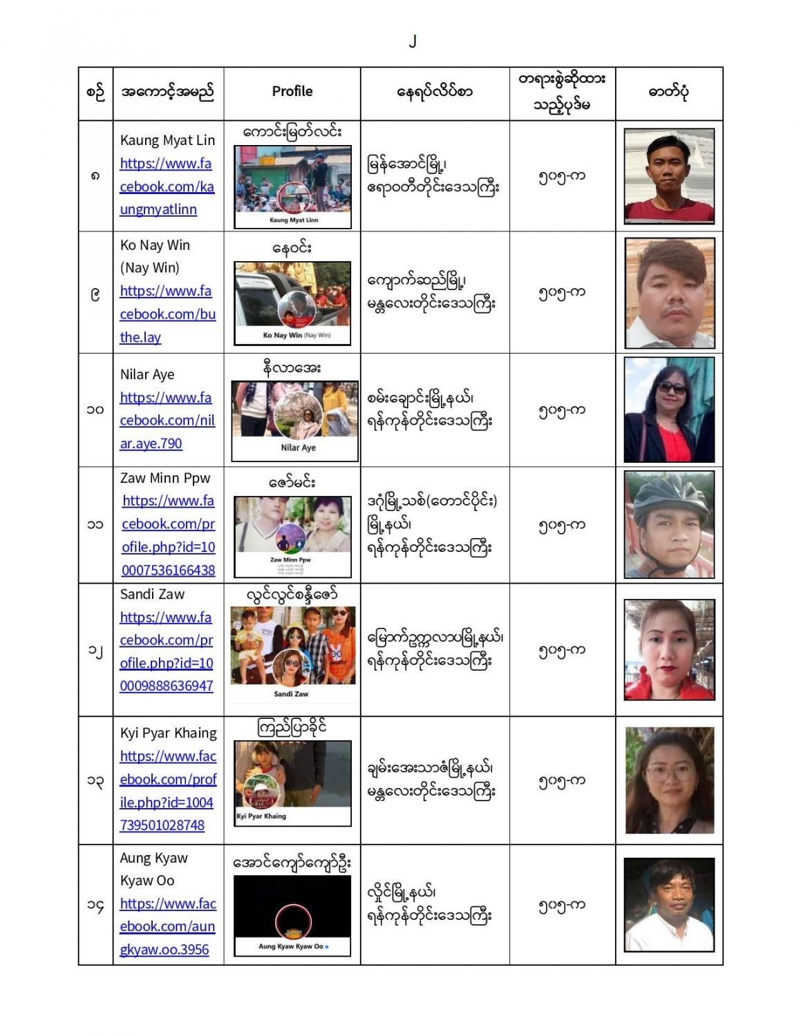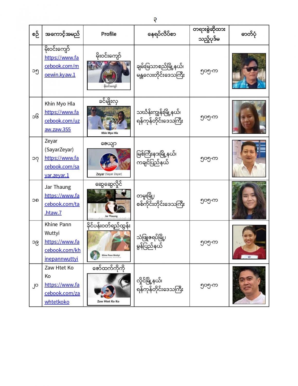 နိုင်ငံတော်၏ အုပ်ချုပ်မှုယန္တရားပျက်ပြားစေရန်ရည်ရွက်ချက်ဖြင့် နိုင်ငံ့ဝန်ထမ်းများအား CDM လှုပ်ရှားမှု တွင် ပါဝင်စေရန်လှုံ့ဆော်ခြင်း၊ CRPH မတရားအသင်းအား ထောက်ခံသည့် အကြောင်းအရာများ၊ မမှန်သတင်းများအားဖြန့်ဝေခြင်း၊ နိုင်ငံတော်တည်ငြိမ်အေးချမ်းမှုကို ပျက်ပြားစေပြီး ဆူပူအုံကြွမှု ဖြစ်ပေါ်စေရန်နှင့် အများပြည်သူအထိတ်တလန့်ဖြစ်စေရန် အတွက် သွေးထိုးလှုံ့ဆော် မှုများပြုလုပ်ခြင်း၊ Social Pumishment ပြုလုပ်ခြင်းများကို လူမှုကွန်ရက် စာမျက်နှာများတွင် ရည်ရွယ်ချက်ရှိရှိ ဖြင့်ဖော်ပြခြင်းနှင့် ဖြန့်ဝေခြင်းများ ဆောင်ရွက် လျက်ရှိသည့် အောက်ဖော်ပြပါ အနုပညာရှင်အချို့နှင့် အခြားပါဝင်ပတ်သက်သူများအား ရာဇသတ်ကြီးပုဒ်မ ၅၀၅-က ဖြင့် အမှုဖွင့်အရေးယူ ဆောင်ရွက် လျက်ရှိပါသည်။
